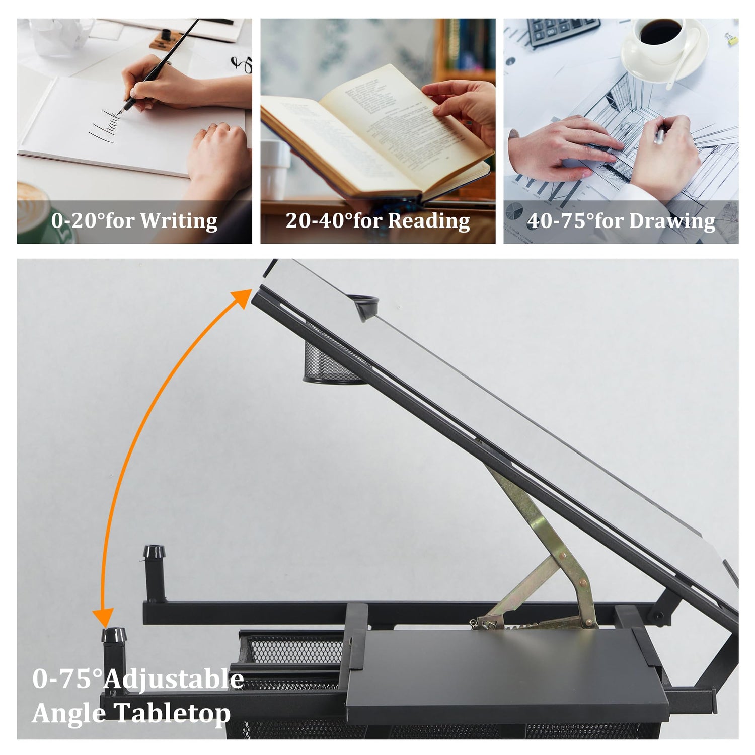- 0-75 Degrees Tilting Angle: The 38.5-inch long and 23.6-inch wide tabletop can be tilted to range from 0-75 degrees from the horizontal to meet different usage needs.