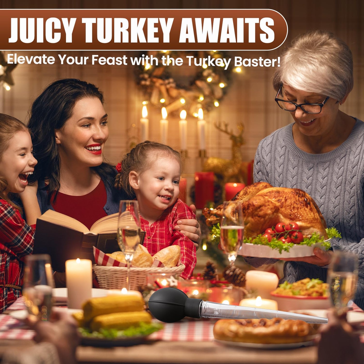 - CREATE JUICY & TENDER MEAT: Impress your family with a juicy feast at Christmas, Thanksgiving, or any family dinner with our premium Turkey Baster. Whether you’re basting a turkey, roasting chicken, or adding flavor to meats, this baster allows you to effortlessly drizzle hot liquids for moist, tender results. It’s a must-have tool for achieving the perfect, juicy turkey your family will love.