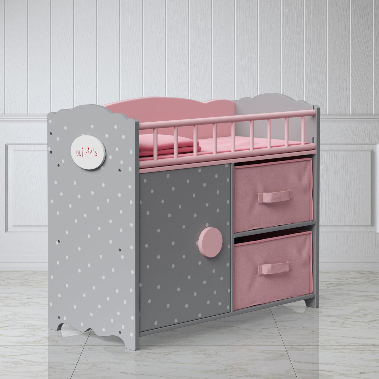 Olivia's Little World Wooden Baby Doll Crib with a Cabinet and Two Cubbies for Doll Accessory Storage Underneath, Pink and Gray and White Polka Dots