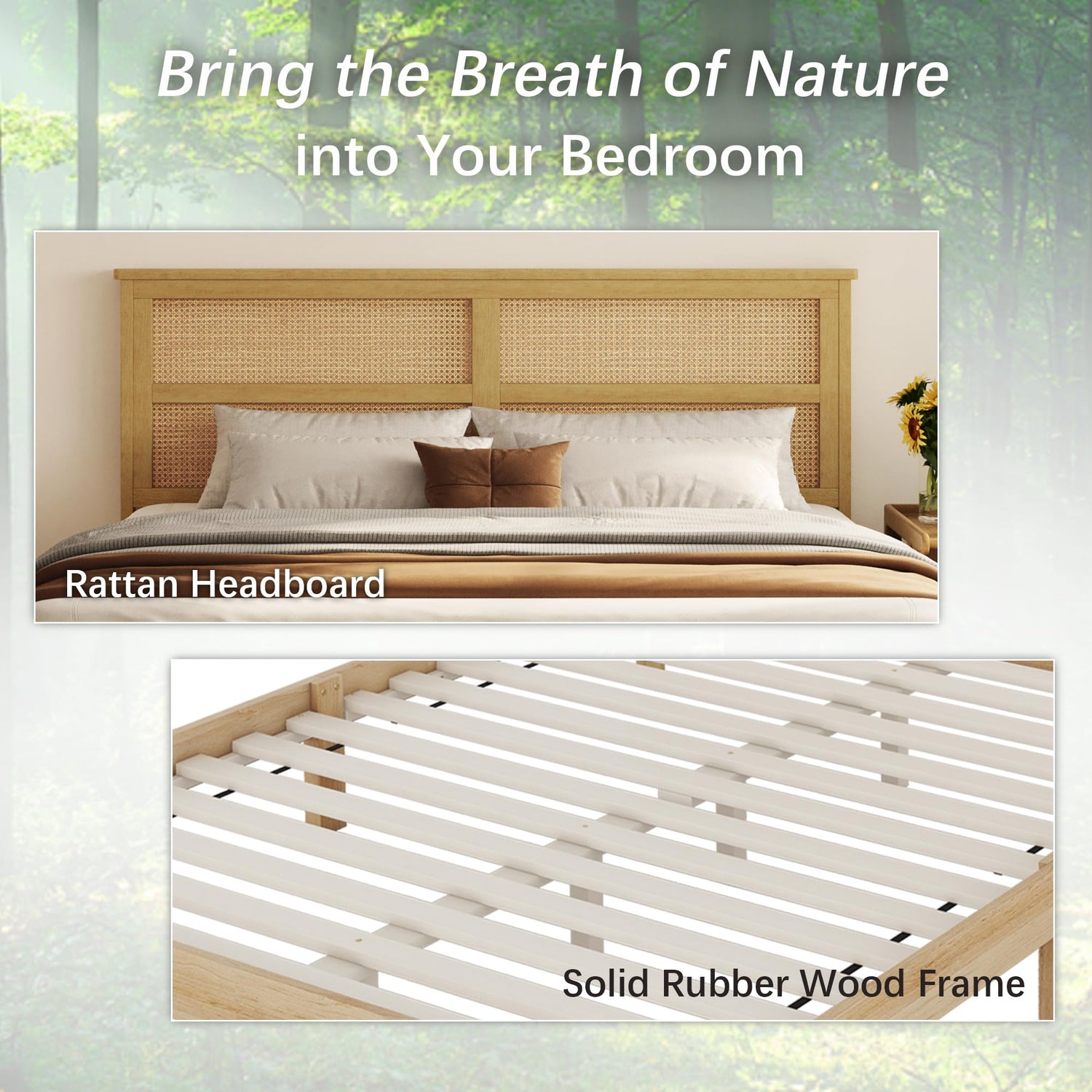 - "Bring the Breath of Nature into Your Bedroom": Featuring a headboard crafted from wood and PVC rattan, paired with a solid rubber wood and engineered wood frame and slats, this bed frame infuses your space with a serene, natural charm.