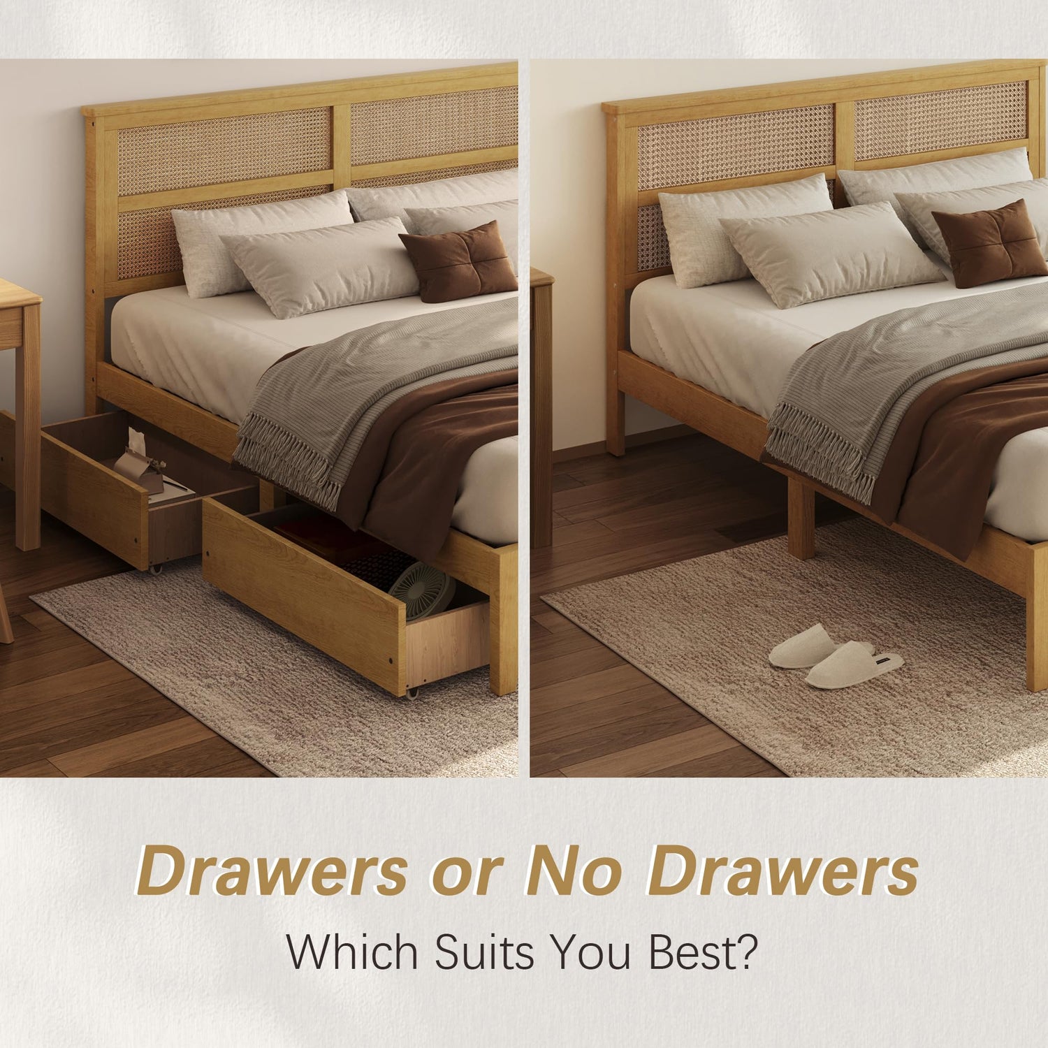 Olodumare Boho King Platform Bed Frame with Rattan Headboard, Modern Natural Bohemian Solid Wood Bed with 2 Under Bed Storage Drawers, Squeak-Free, No Box Spring Needed, Easy Assembly, Honey Oak