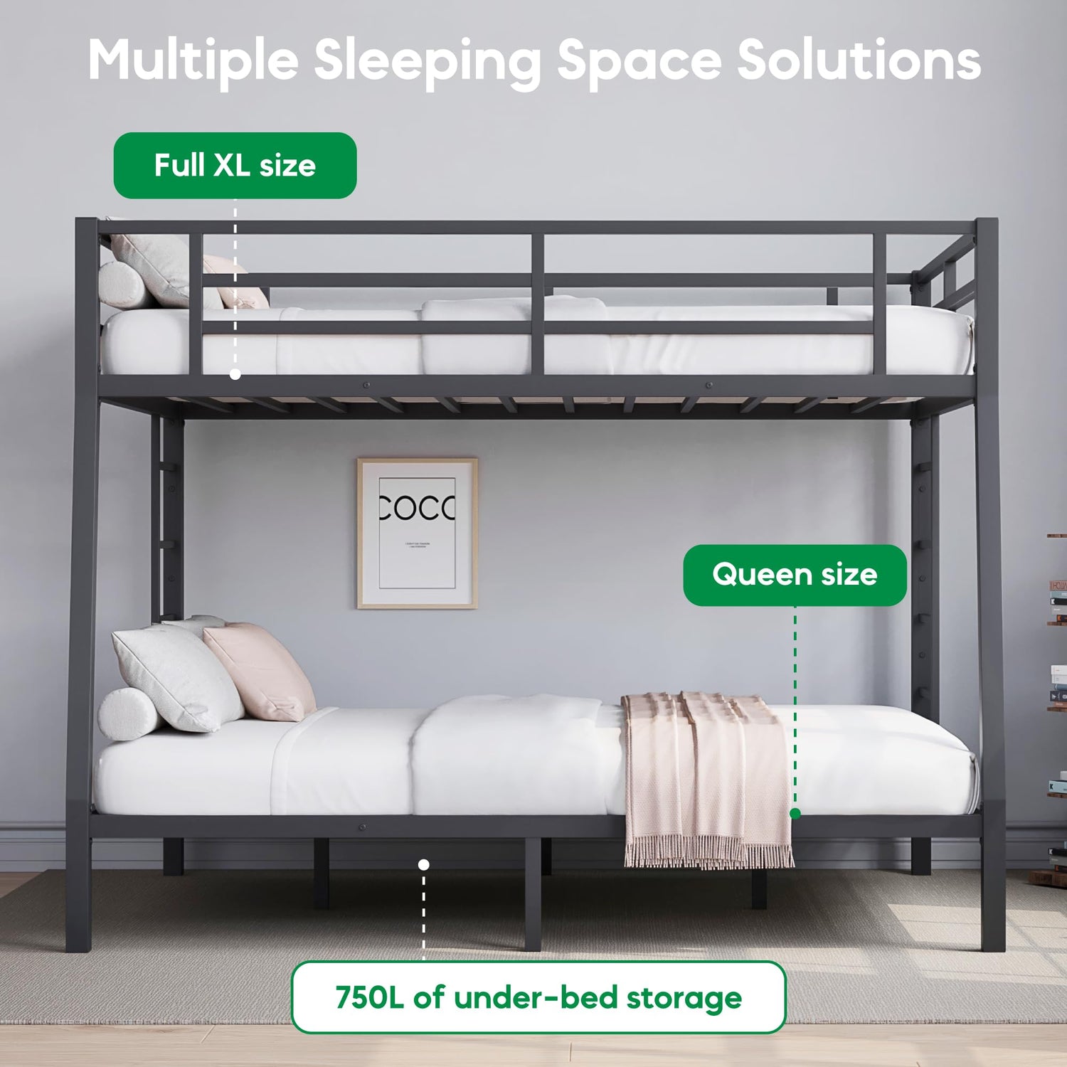 - “Multiple Sleeping Space Options”: The upper bunk offers the choice of Twin XL or Full XL, spacious enough for both kids and adults. The lower bunk provides luxurious space with options for Queen or King-sized sleeping areas. Choose between a sleek floor-level bed or a functional design with 750L of under-bed storage.
