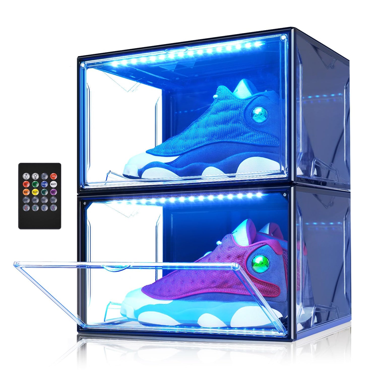 Oltraman Shoe Storage Organizer for Closet, Foldable Shoe Boxes Rack 2 pack, Clear Plastic Stackable Containers Bins Holder, Magnetic Sneaker Shelf for Sneakerheads with LED Lights (Black)