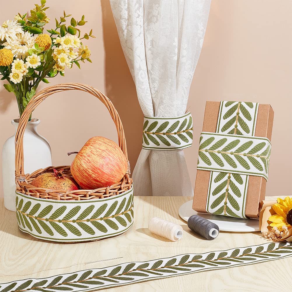 OLYCRAFT 10.9Yards Jacquard Ribbon Trim 2.4 Inch Leaf Pattern Jacquard Polyester Ribbons White Green Leaf Jacquard Woven Embroidery Trim for DIY Sewing Crafts Handmade Bag Belts Clothing Decoration