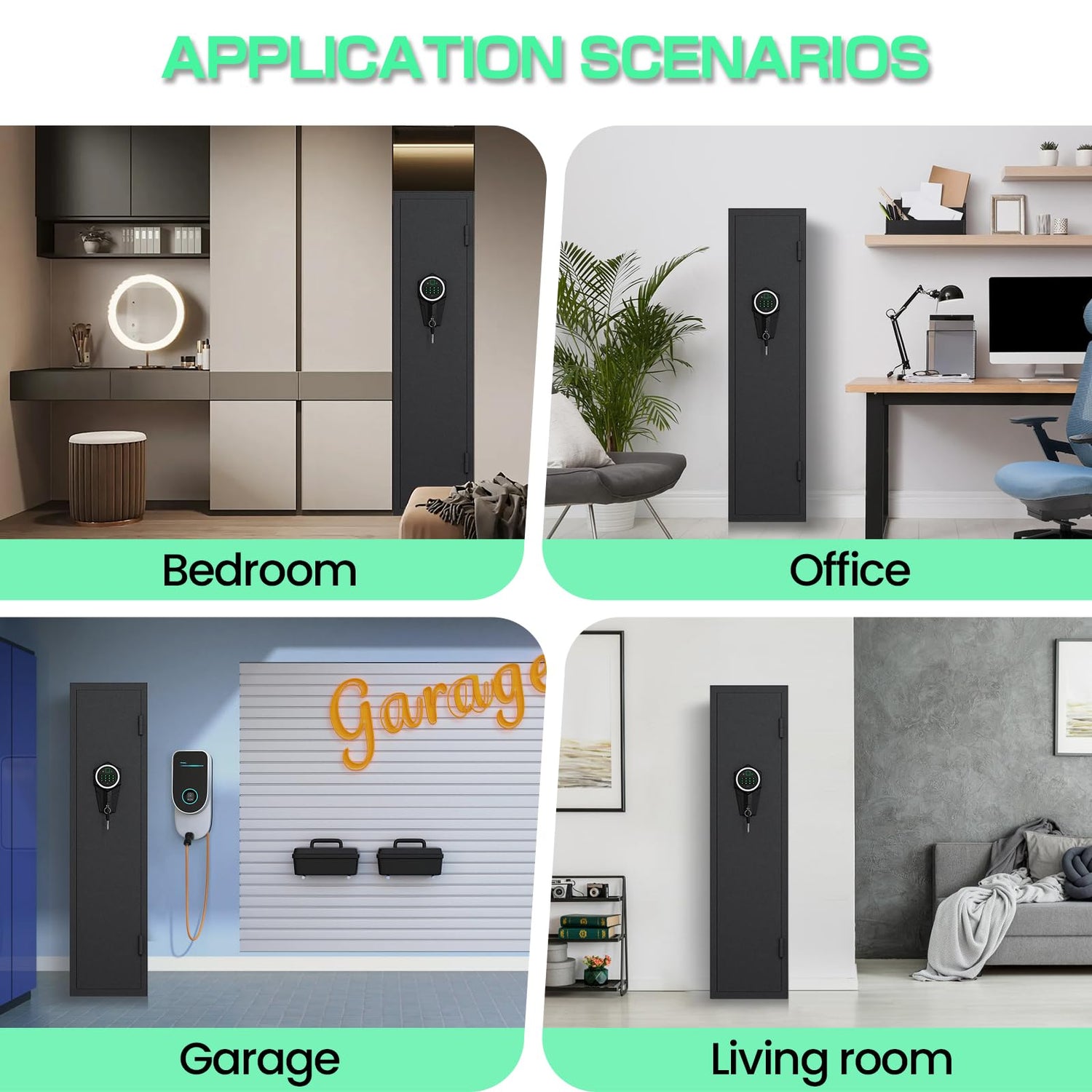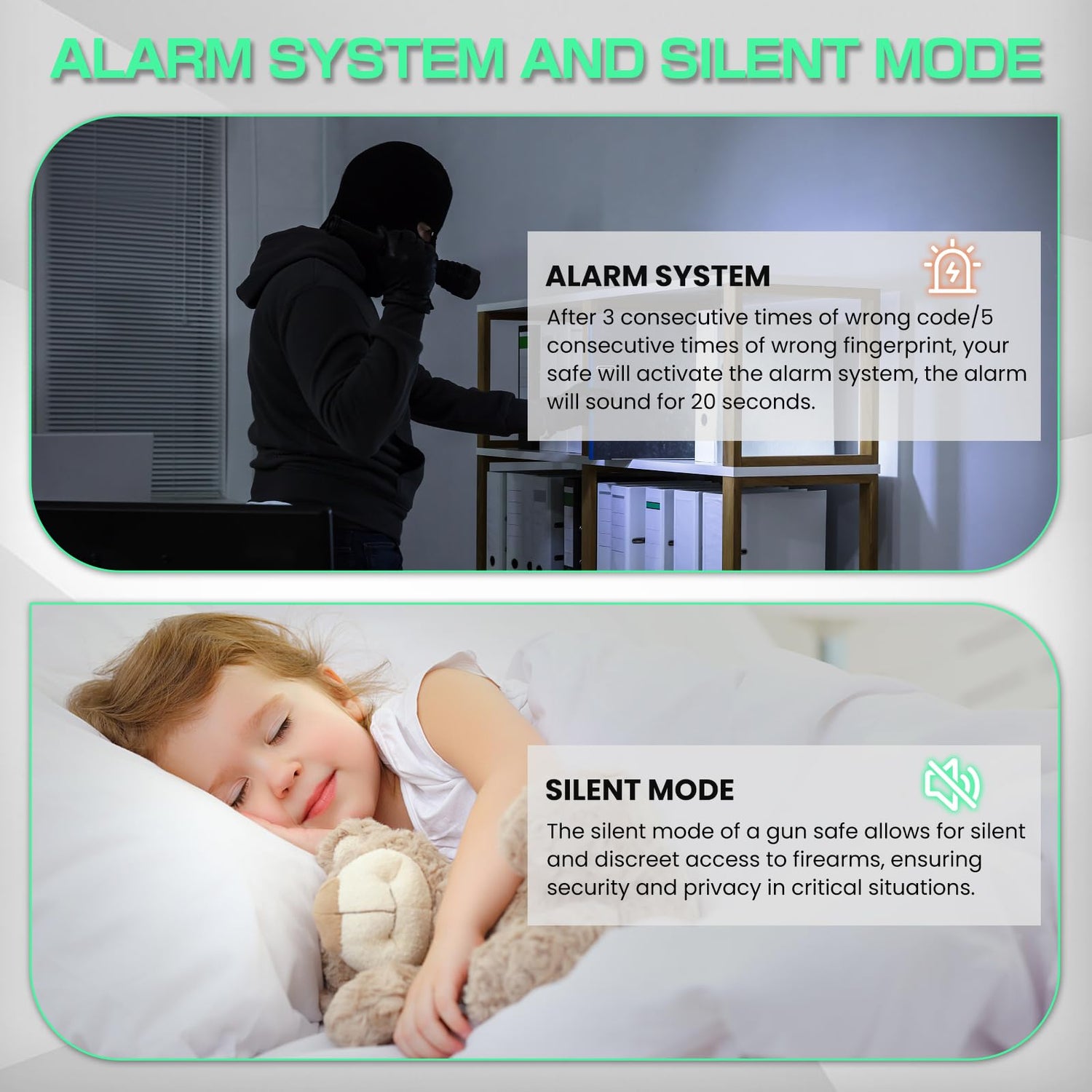- 【Dual Alarm System and Silent Mode】Equipped with a dual alarm system, our rifle gun safe offers enhanced security measures. The vibration alarm is triggered by shaking or moving the gun safe, while an input error alarm activates after 3 incorrect password attempts. The buzzer will sound for 20 second when the alarm is activated, which can be heard throughout the house. The silent mode option ensures discreet operation, ideal for preventing theft or disturbances.