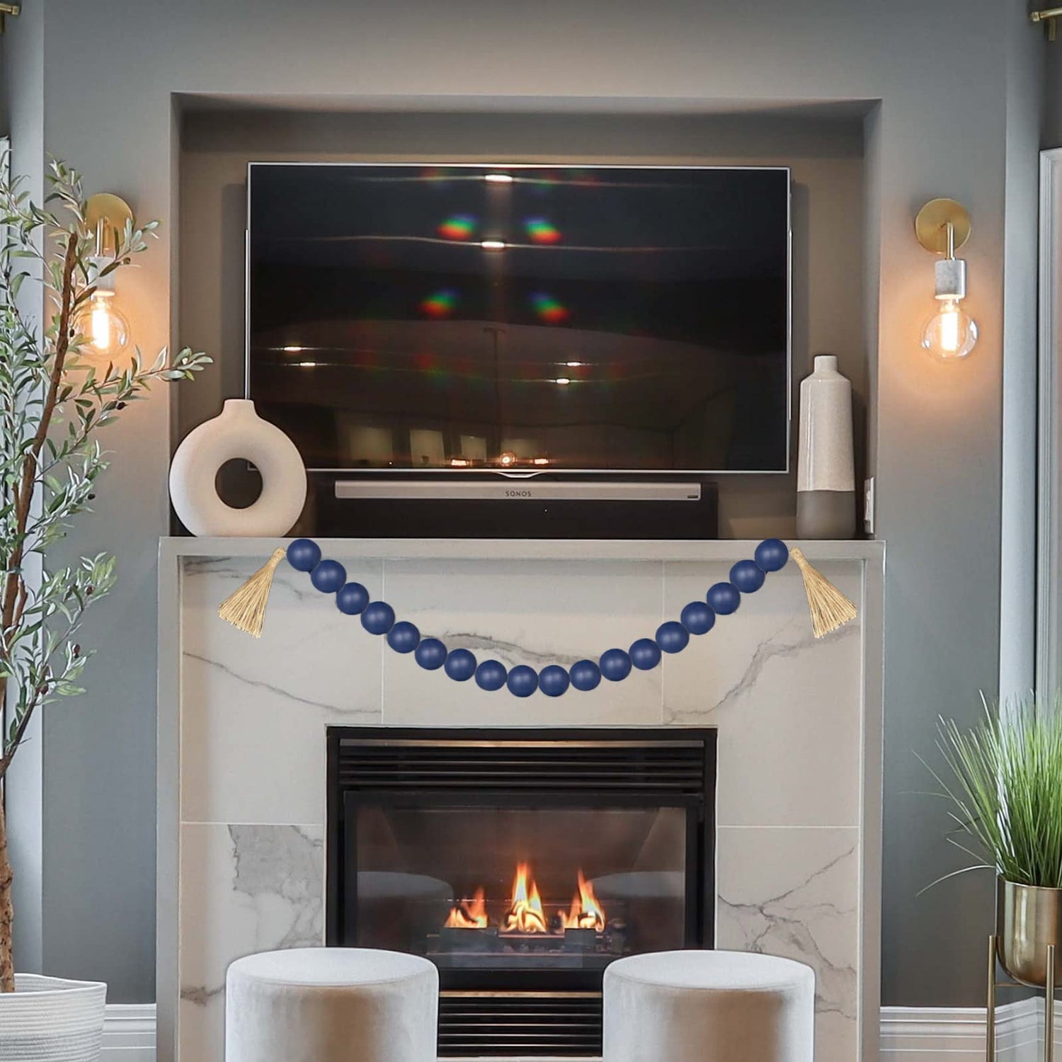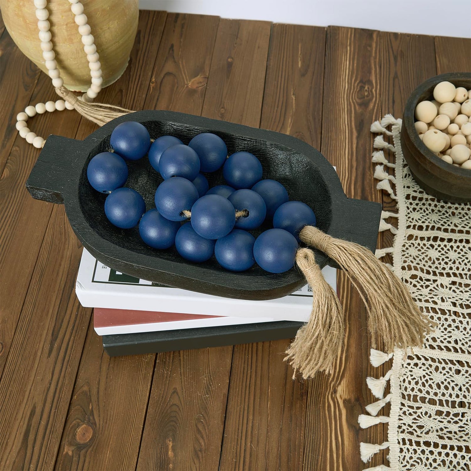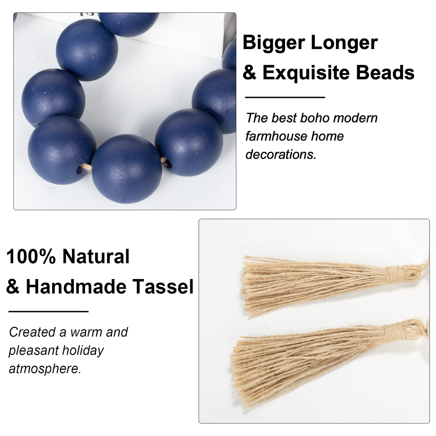 - NATURAL MATERIALS: Home decor tassels garland navy blue is made of wooden beads and twine to make a natural wooden bead string, bring your family, wife, husband, children, grandfather, grandmother a sense of relaxation and happiness in daily life. Farmhouse beads natural grain patterns and classsic navy blue colors that can be matched with various styles of home decor, adding a elegant beauty to your room.