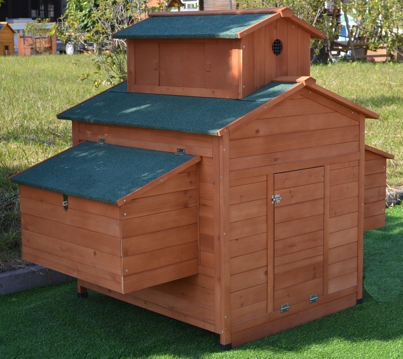 Details: This chicken house with ramp & large living house & 6 nesting boxes. It is constructed by high quality solid Fir wood. All timber are T&G plained to aviod splintering. All joints are mortise and tenon, 2 x access doors for easily catch your pets. Come model come with a rear zinc pull out tray for easy cleaning.