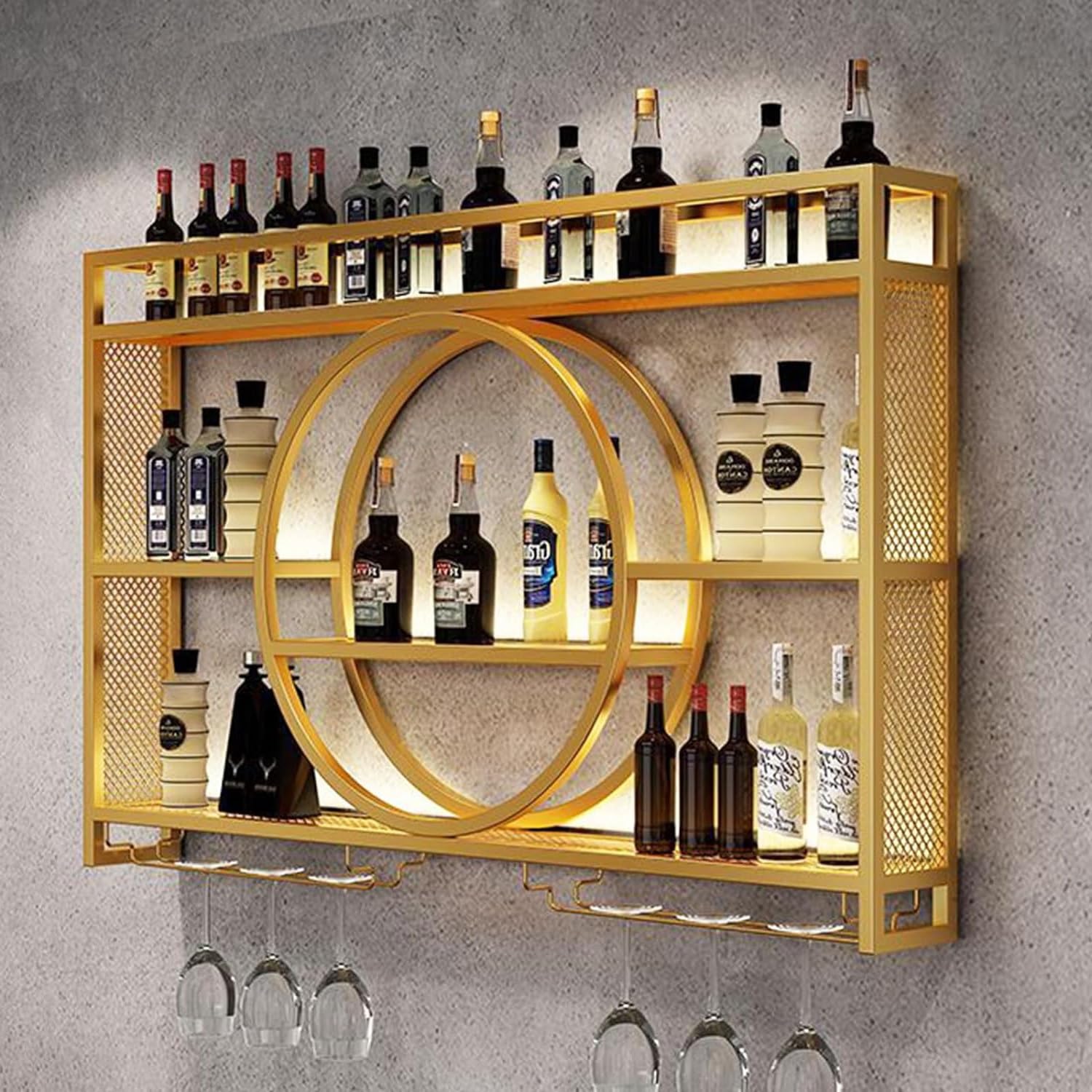 OMKUOSYA Wine Rack Wall Mounted with LED Light, 3-Tier Metal Floating Bar Shelves Wine Glass Holder, Liquor Bottle Storage Display Shelf for Home Bar, Dining Room & Kitchen (Gold, 39.4in/100cm)