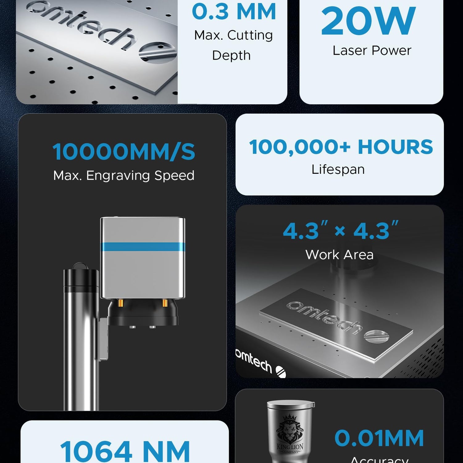 - 20W Marking Laser: With a durable laser source that lasts up to over 100,000 hours, OMTech's fiber laser marking machine allows you to create a vibrant array of designs on various materials including metals, plastic, stone, and more!