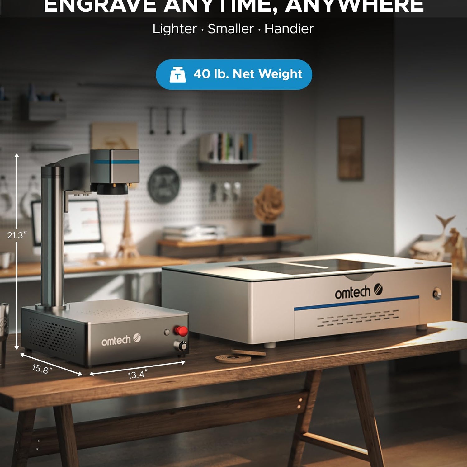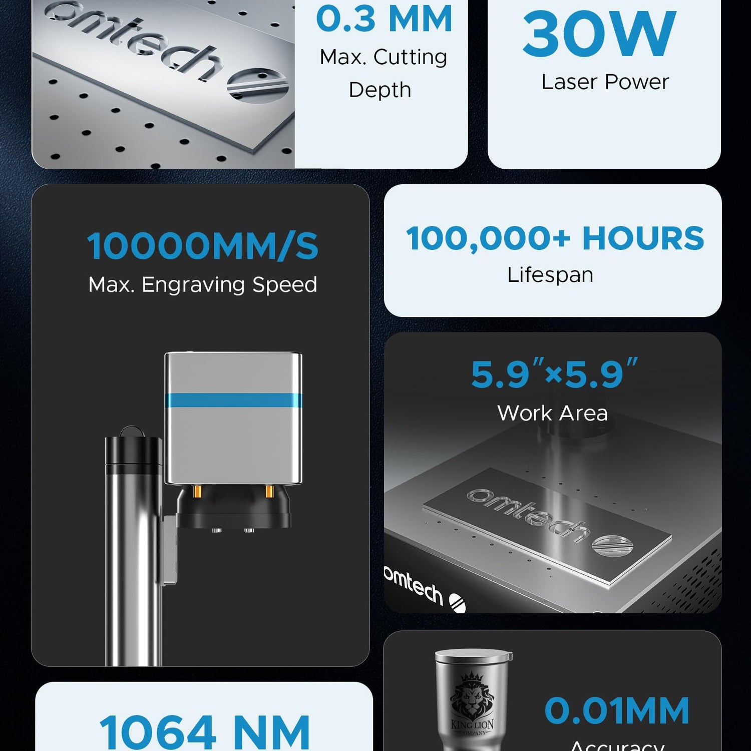 - 30W Marking Laser: With a durable laser source that lasts up to over 100,000 hours, OMTech's fiber laser marking machine allows you to create a vibrant array of designs on various materials including metals, plastic, stone, and more!
