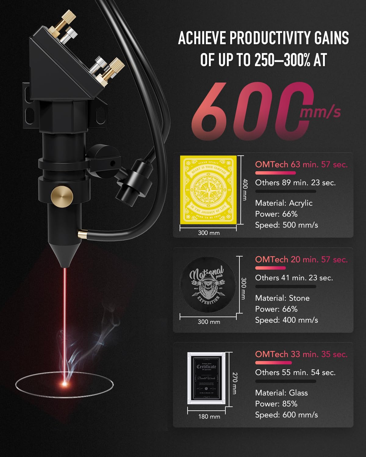• Commercial Laser Cutter with LightBurn: OMTech's 60W CO2 laser engraver engraves as deep as 0.4" (10 mm) on wood, glass, acrylic, leather, and more nonmetallic materials at speeds up to 23.6 ips (600 mm/s). The bundled LightBurn software allows you to transform your artistic visions into stunning realities with intuitive navigation.