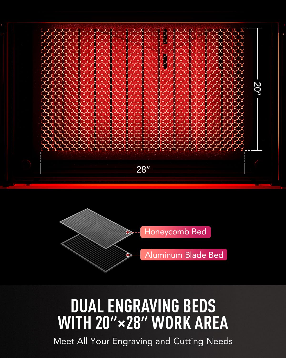 • Handle Large Items with Ease: The honeycomb and aluminum blade beds feature a 20"x28" (500x700 mm) work area to fit most projects. The four-way pass-through doors make it a breeze to accommodate larger and longer items.
