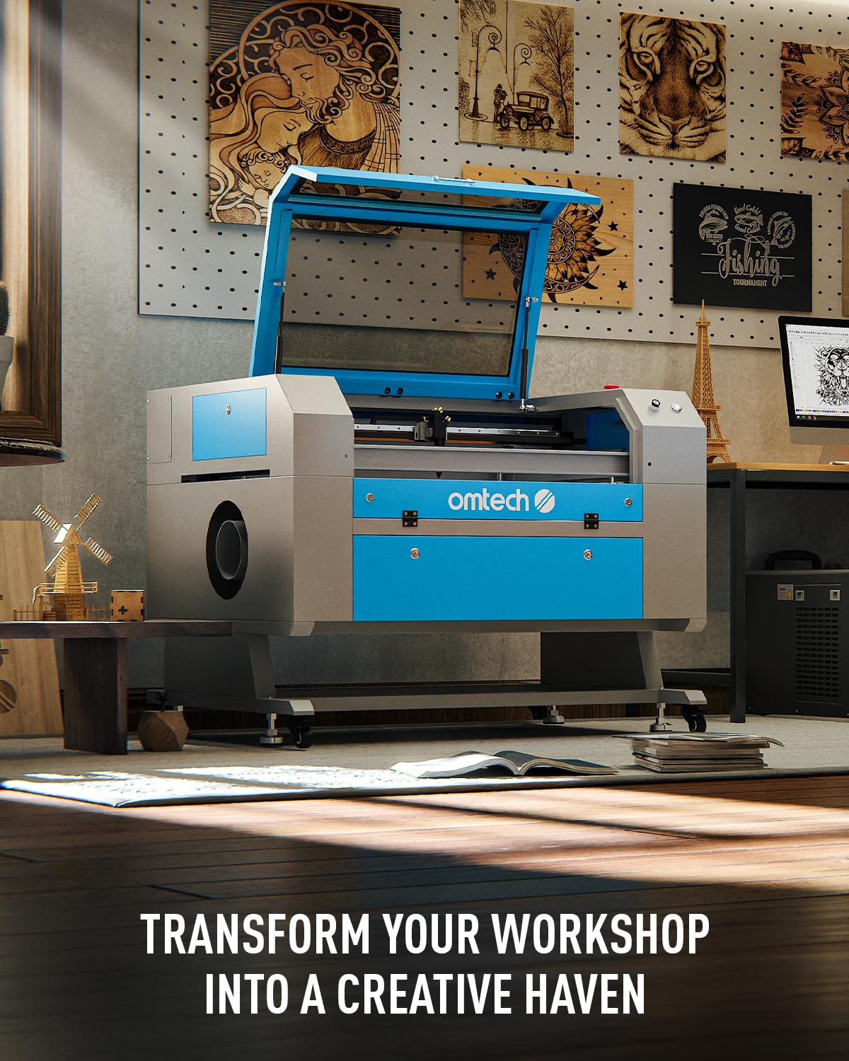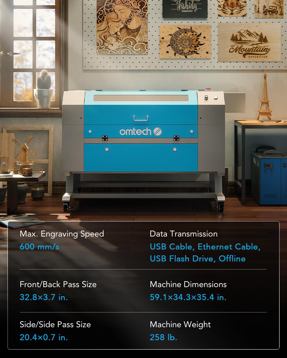 - Commercial Laser Cutter with Water Chiller: OMTech's 80W CO2 laser engraver engraves as deep as 0.4" (10 mm) on wood, glass, acrylic, leather, and more nonmetallic materials at speeds up to 23.6 ips (600 mm/s). The bundled water chiller provides effective cooling for extended engraving sessions.