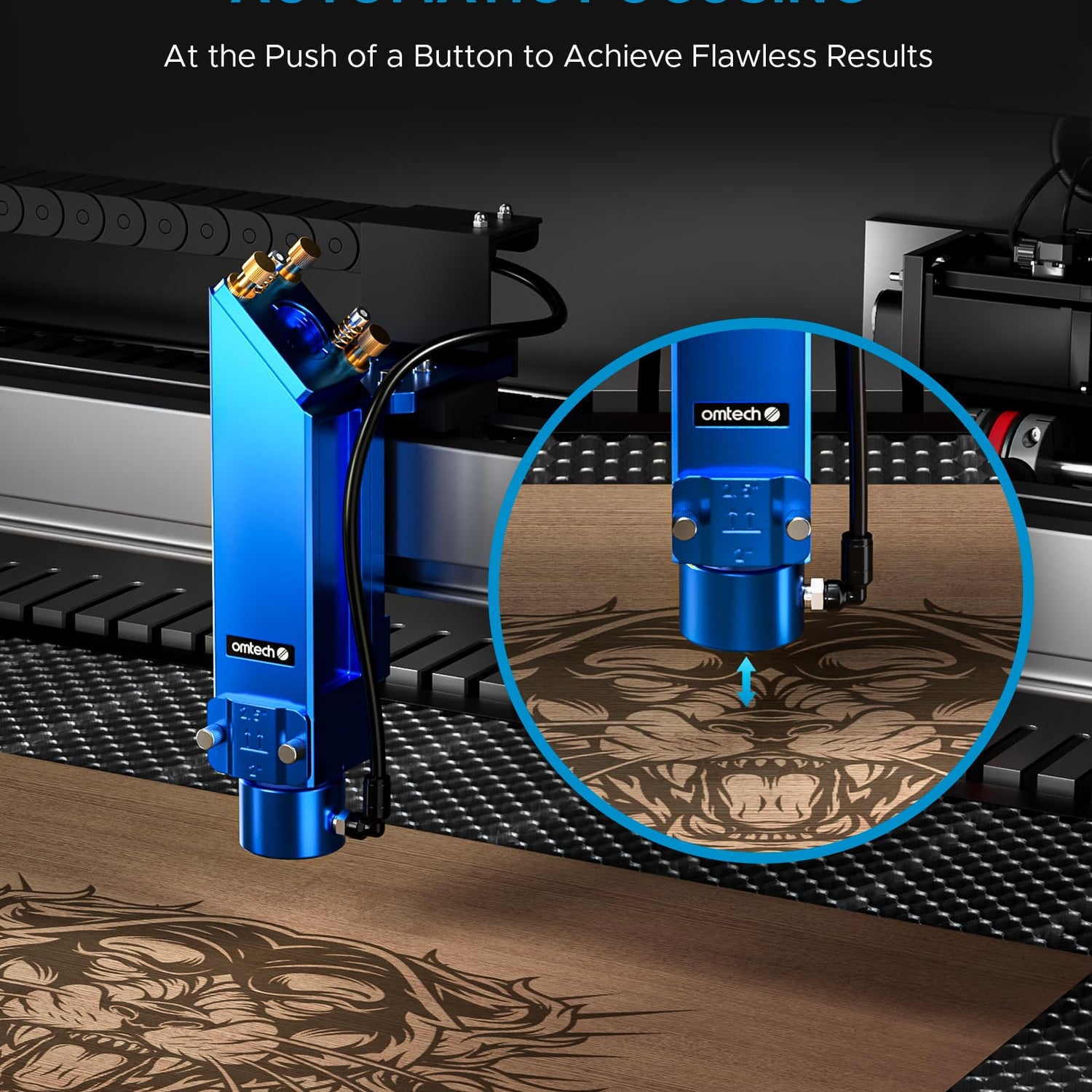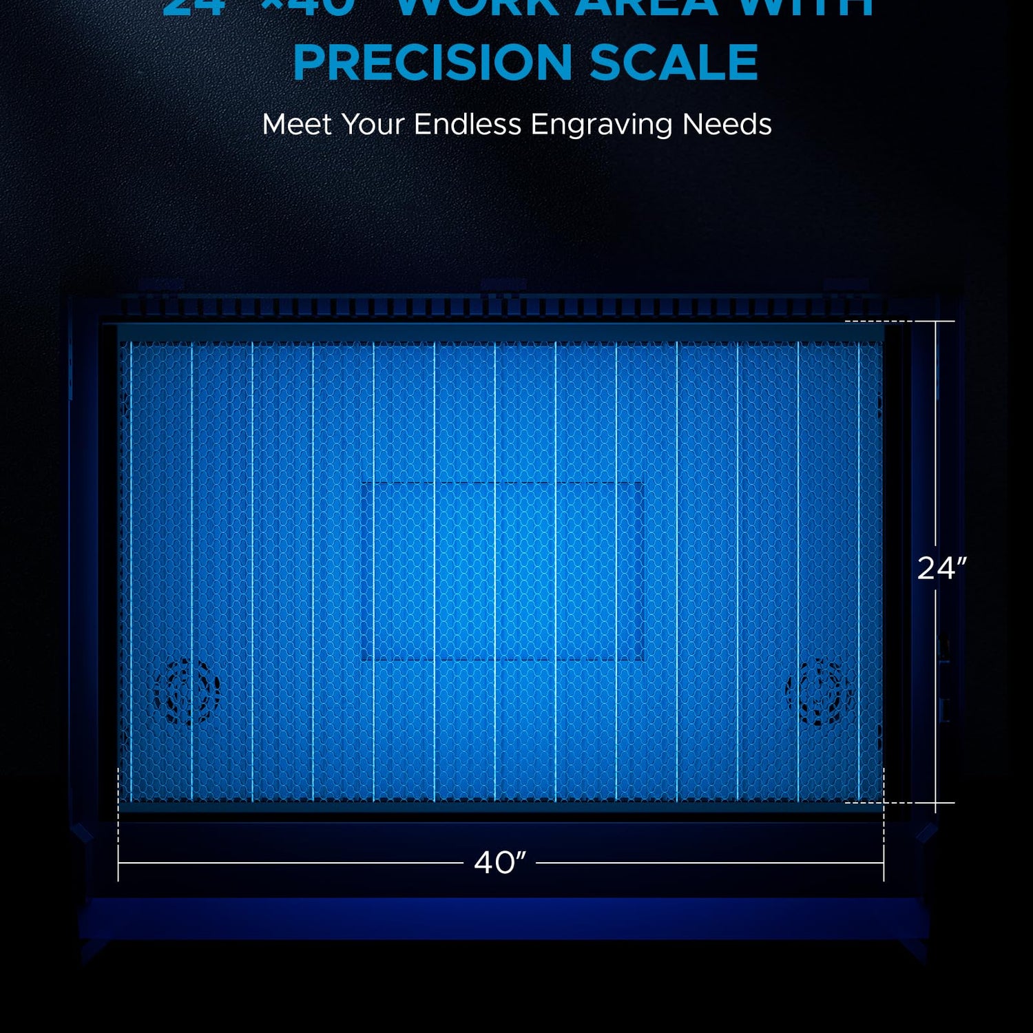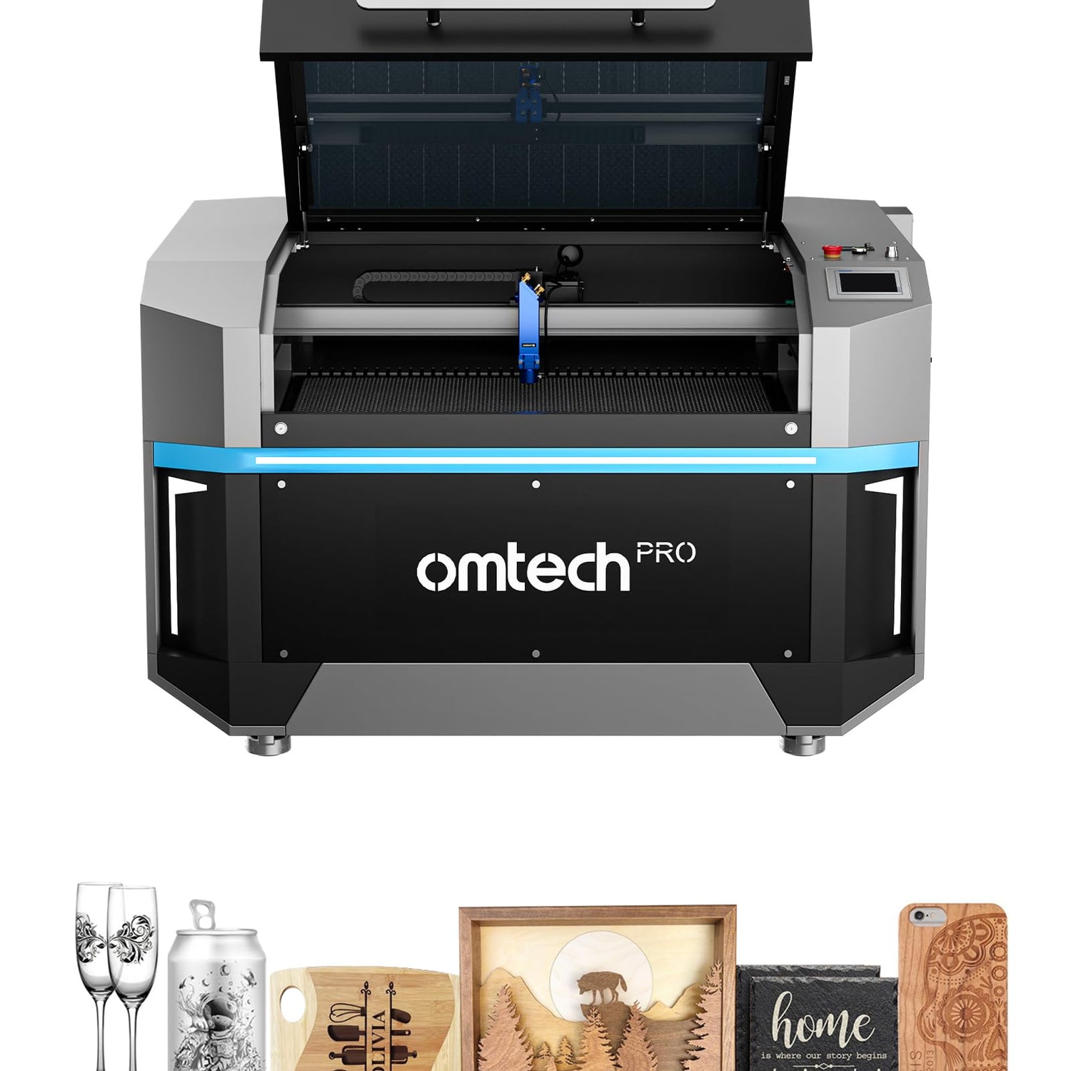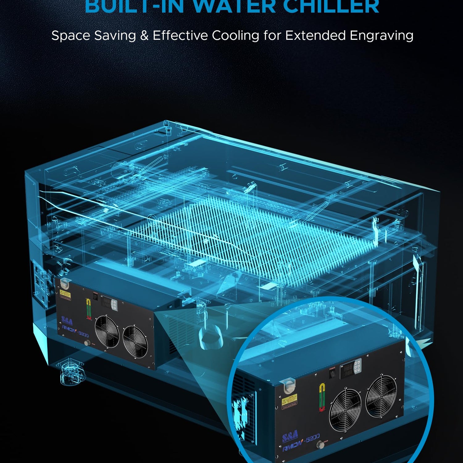- Design, Engrave, & Impress: OMTech Pro's 100W CO2 laser engraver effortlessly engraves on diverse nonmetallic materials, such as wood, glass, acrylic, and more, within its expansive 24"x40" workspace. The built-in CW-5200 water chiller ensures efficient cooling at 5186 BTU per hour, maintaining temperatures within only 0.5°F through integrated sensors.