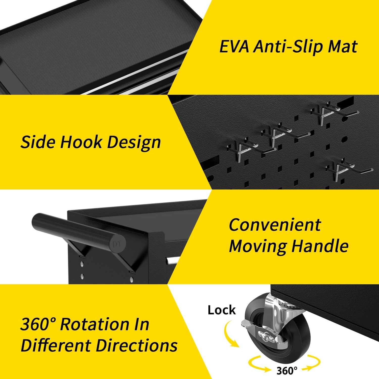- ⚙️【Hooks and Anti-Slip Pads】When you use the rolling tool chest, you no longer need to worry about the sliding and placement of the drawers. Because our tool box is equipped with well-designed drawer anti-slip pads and practical hook functions to effectively protect your tools. The hooks on the side of the tool box are also at your service at any time.