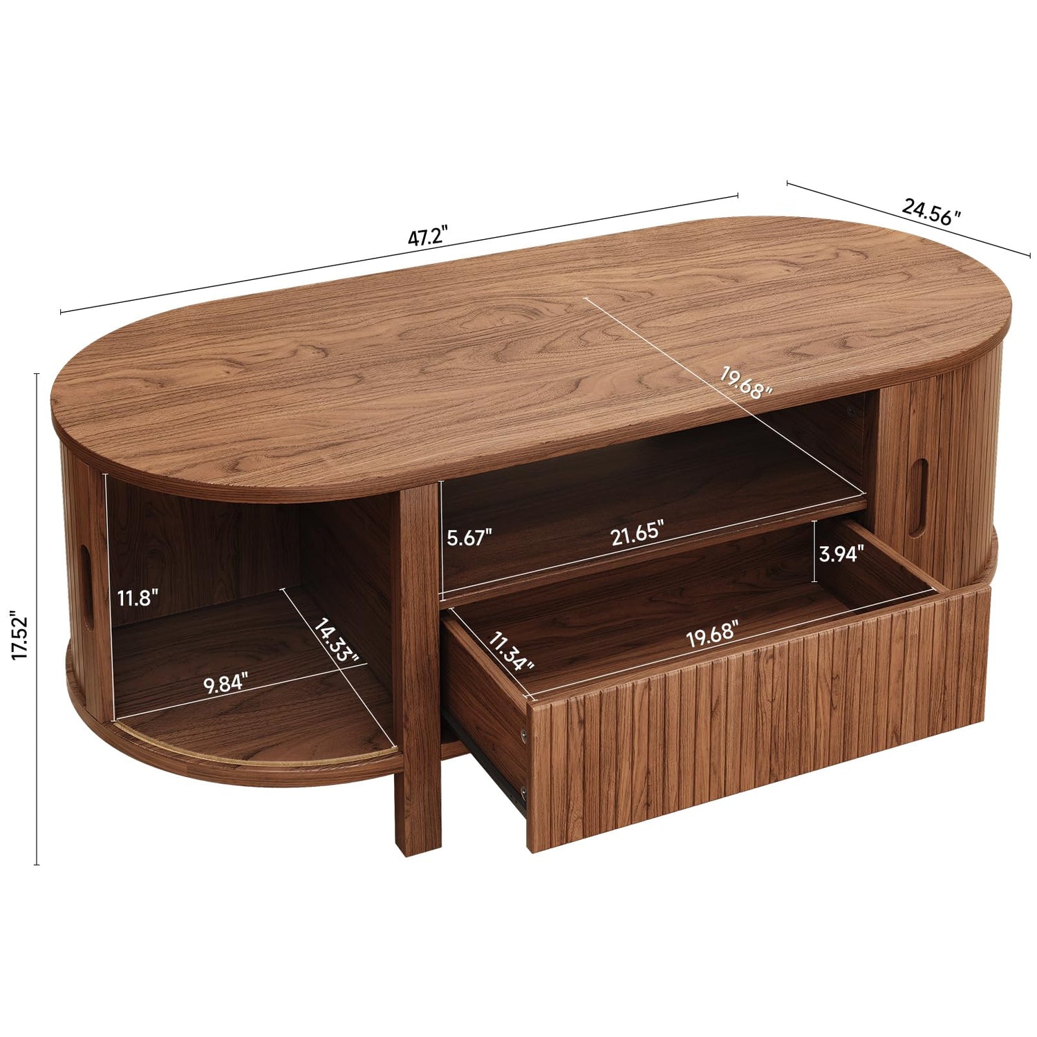 ONBRILL 47.2 Inch Oval Coffee Table with Storage, Mid Century Modern Coffee Table with Drawer, Center Table with Sliding Door and Wood Fluted Handle for Living Room, Walnut