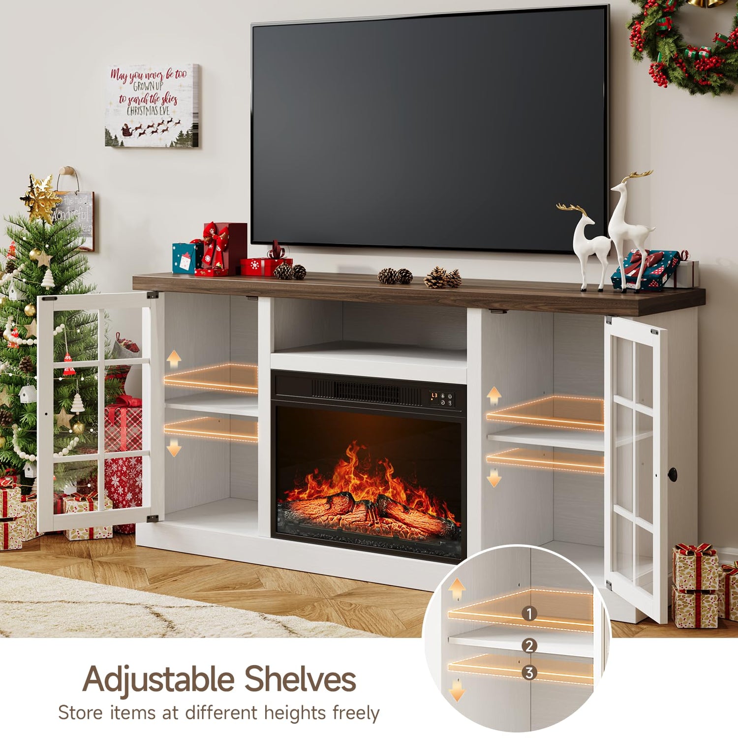 - [Large Storage Space & Adjustable Shelves] The Fireplace TV Stand offers ample storage space to keep your living area neat and tidy. These 2 side cabinets have adjustable shelves with 3 heights for your flexible storage. 59" wide tabletop can comfortably accommodate TVs up to 65 inches, making it an ideal focal point for your home entertainment center