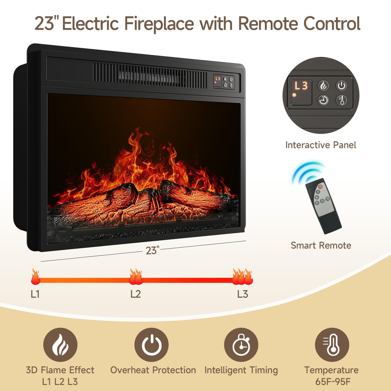 - [23" Electric Adjustable Fireplace] The ONBRILL TV stand for living room has a built in 23-inch electric fireplace with realistic 3D flames and adjustable 3 brightness levels. Enjoy the cozy ambiance of a real fireplace without the mess or maintenance. The 1400W heater provides efficient heating, so you can stay warm at home in winter