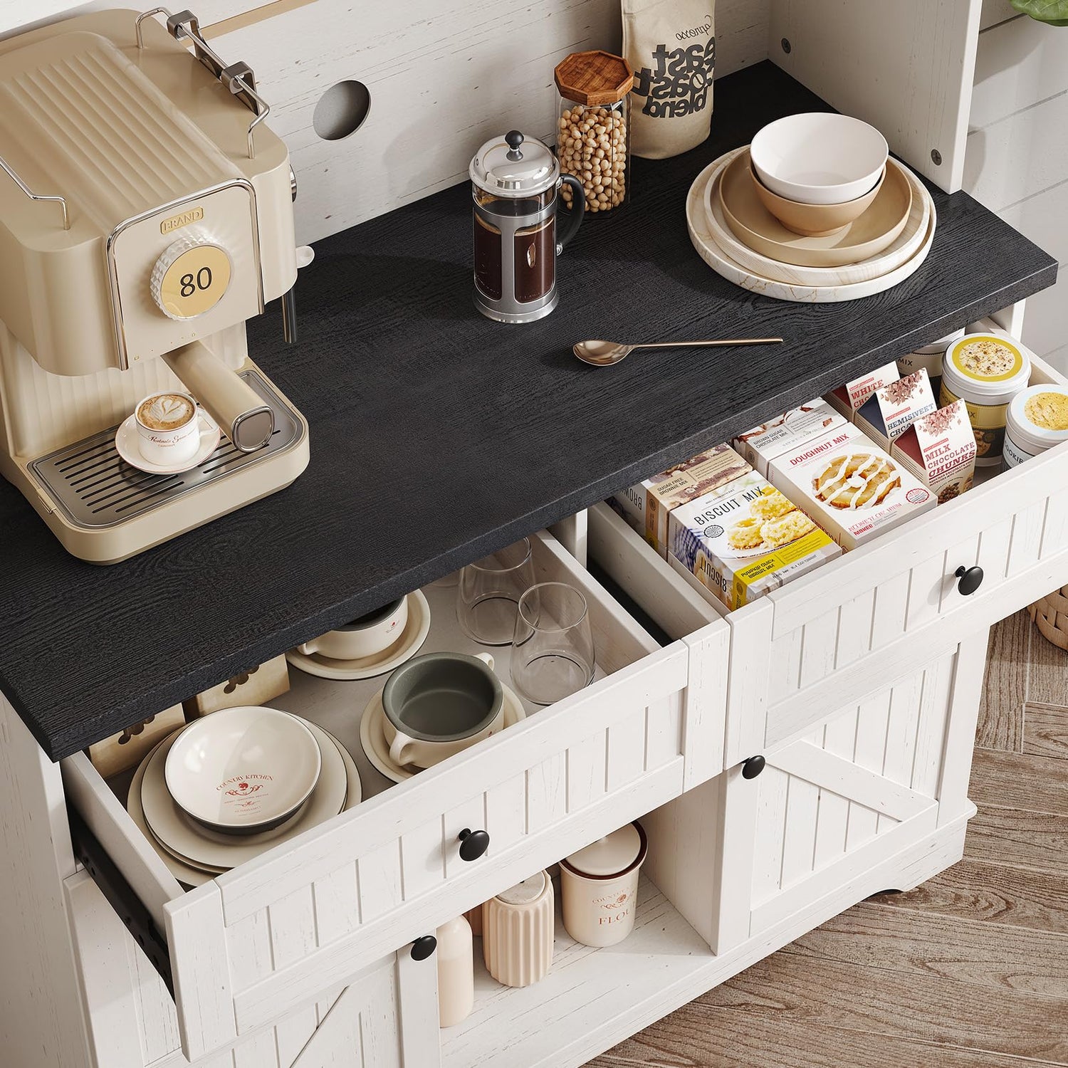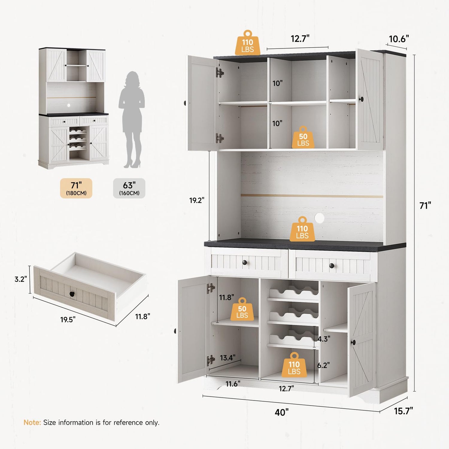 - Large Storage Space: The kitchen hutch cabinet is equipped with 2 deep drawers for detailed storage, and the 5 storage cabinets can easily accommodate large items, making the mess instantly orderly. The wide countertop is used as a practical work area, where daily necessities such as microwave ovens are placed, making kitchen operations more handy