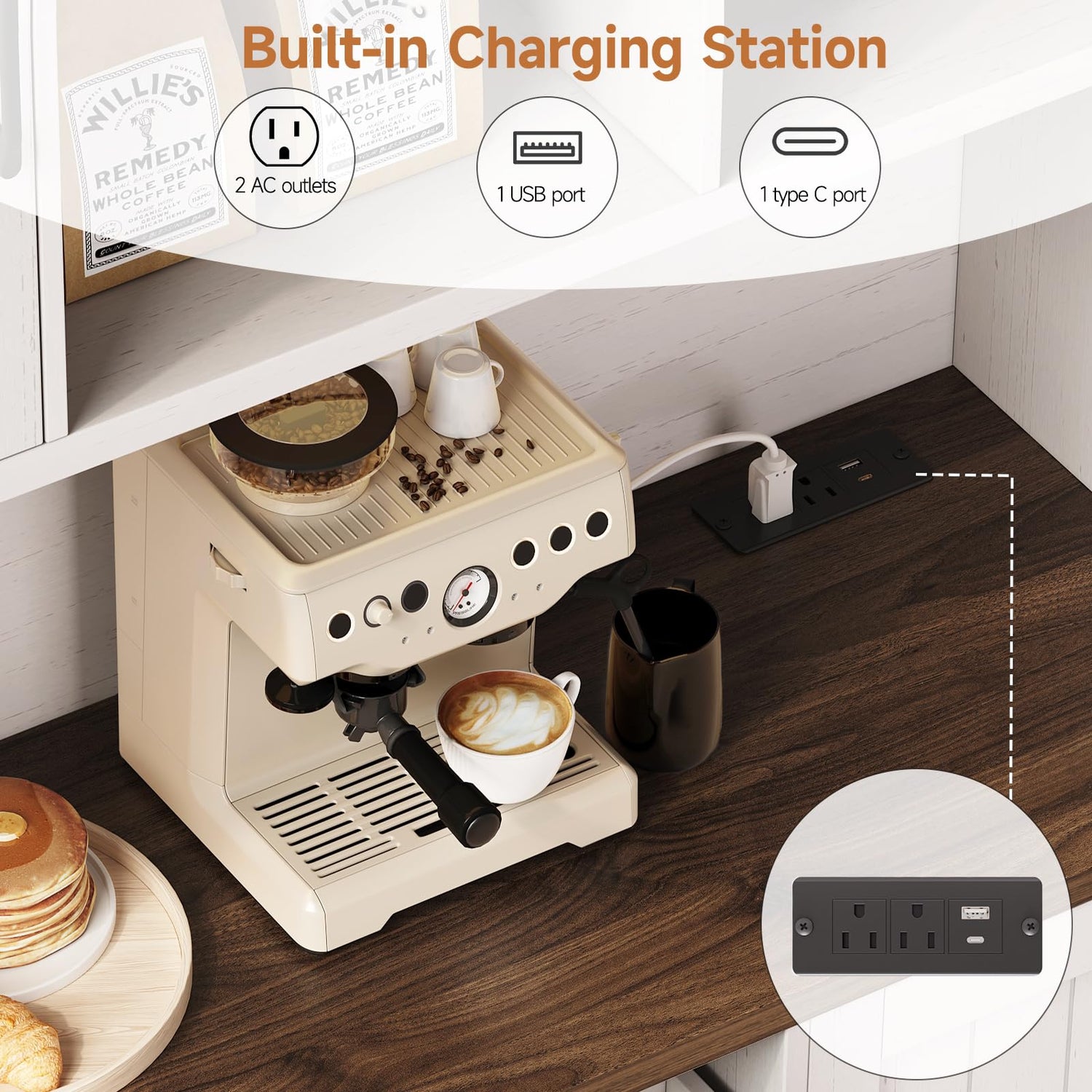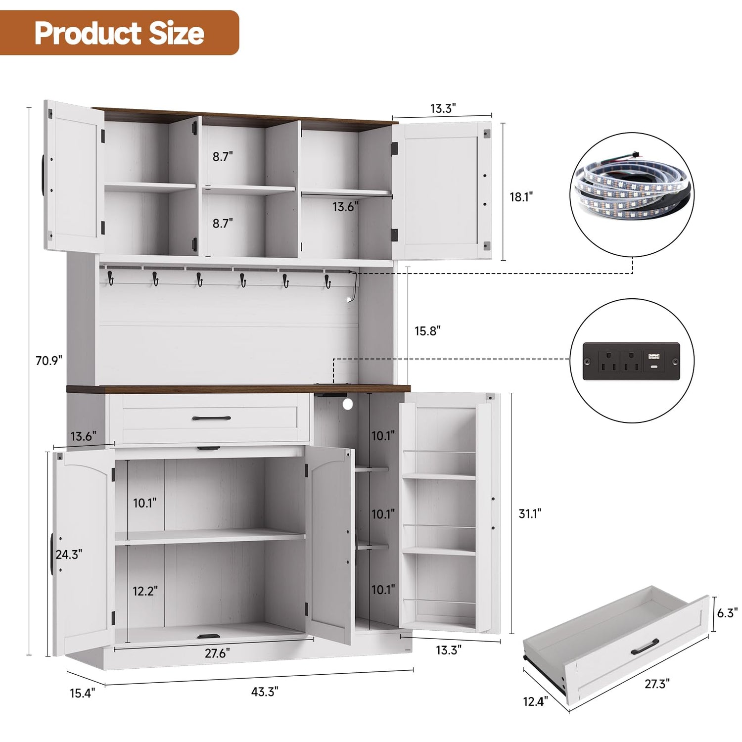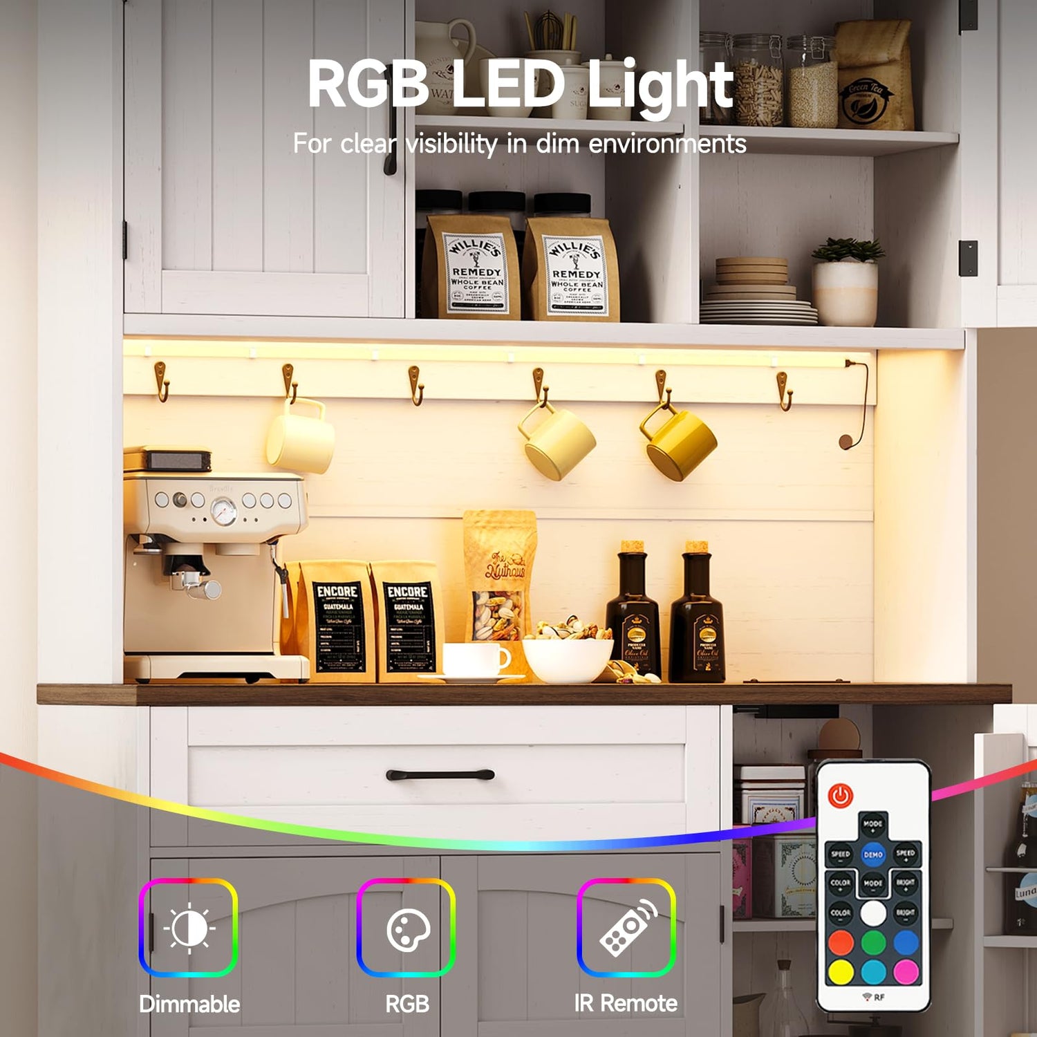 - LED LIGHT & POWER OUTLET: The kitchen pantry storage cabinet is designed with brightness adjustable LED light. It has a variety of colors and flashing modes for the desired cozy ambiance. In addition, the pantry cabinet equipped with 2 AC outlets, 1 USB port, and 1 type C port, keeps your devices charged with convenience.
