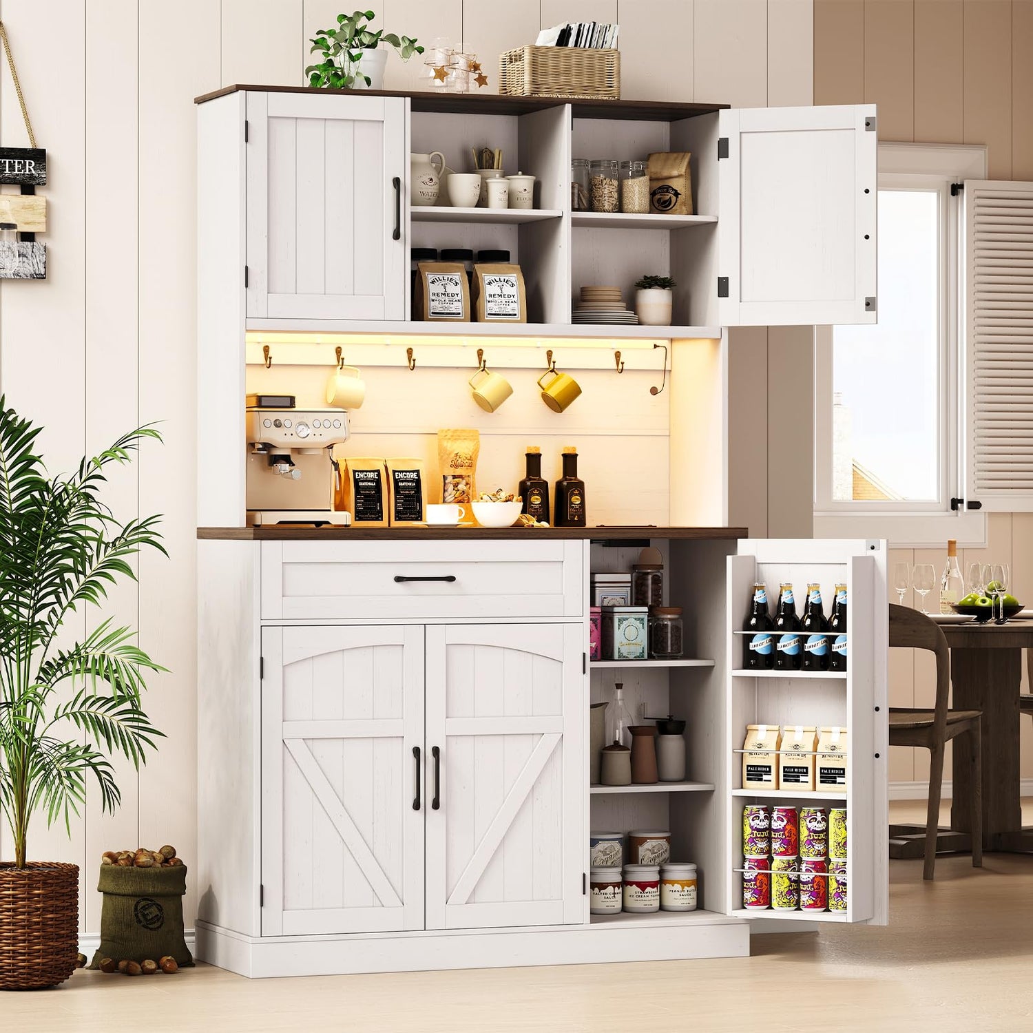 - AMPLE STORAGE SPACE: This kitchen pantry storage cabinet has generous storage space, it contains 5 doors, 6 upper cabinets with adjustable shelves, 3 door shelves, a drawer, the microwave shelf with 6 hooks, a built-in charging station, and LED lights. This pantry cabinet is a perfect solution to the storage challenges of kitchen clutter.