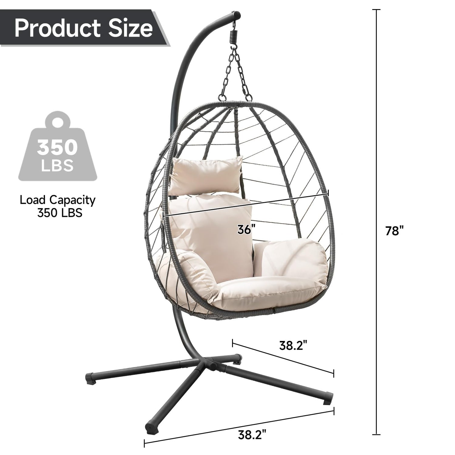 ONBRILL Hanging Egg Chair with Stand, Outdoor Indoor Egg Swing Chair with Cushion Headrest, Rattan Wicker Egg Chair with Dual Chains, 350LBS Capacity for Patio, Porch, Balcony, Bedroom (Khaki)