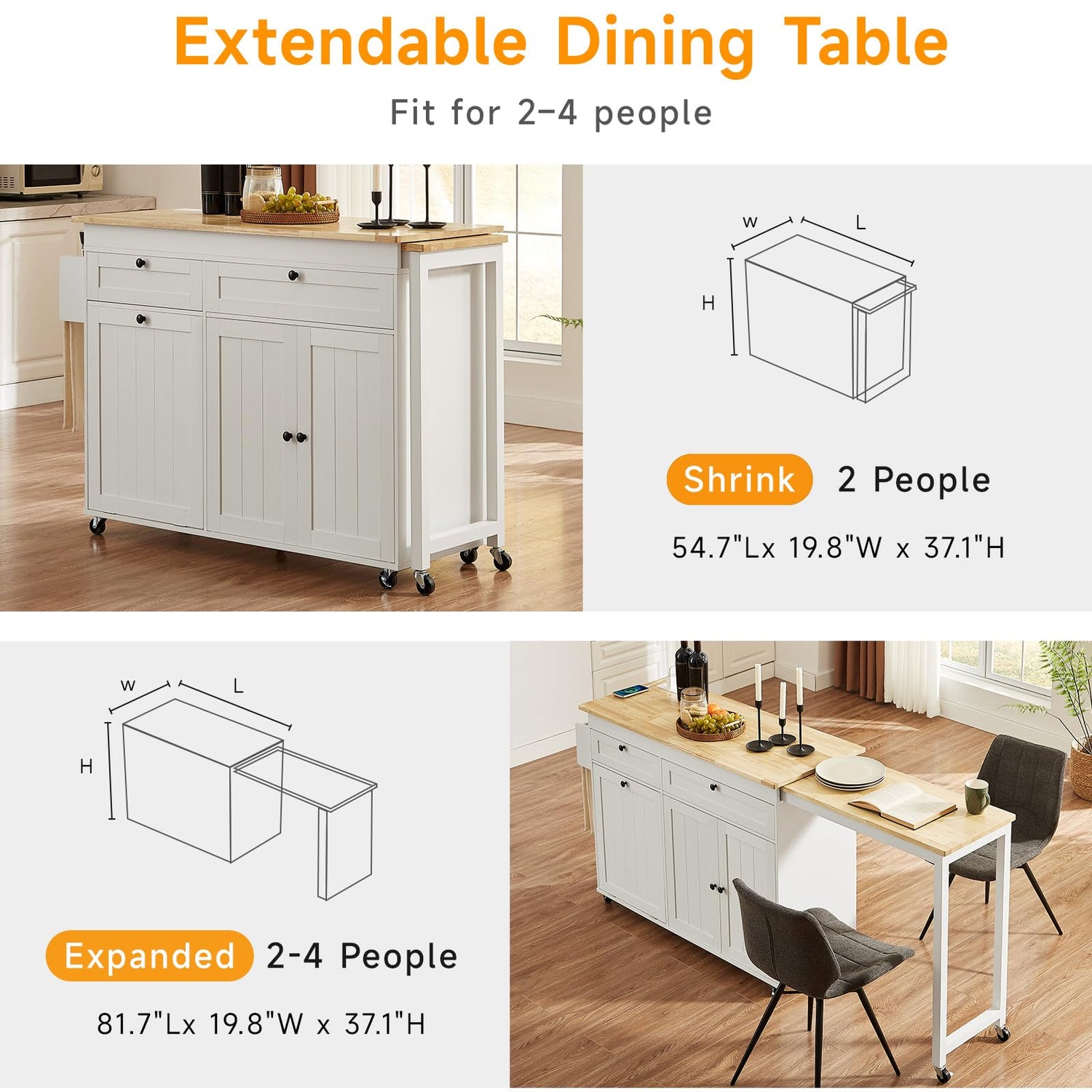 ONBRILL Kitchen Islands with Extendable Dining Table, 81.7" Mobile Kitchen Storage Islands, Rolling Kitchen Cart with Trash Cabinet, Power Outlet, Spice Rack & Towel Rack (White)