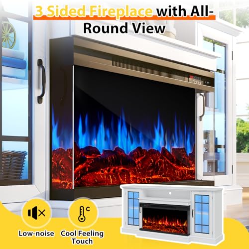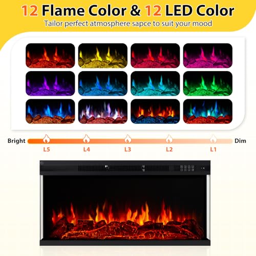 - 3-Side Glass Display Fireplace: The fireplace is designed to offer a wide view of the fire from three sides. This creates a stunning visual effect. Featuring 5 settings for flame brightness, 12 colors of backlight and 12 LED colors of light strips