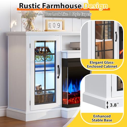 OneBlis 70 Inch Fireplace TV Stand for TVs up to 80", Rustic Media Entertainment Center Console Table with Glass Door Closed Storage, 3-Sided Glass Fireplace, White