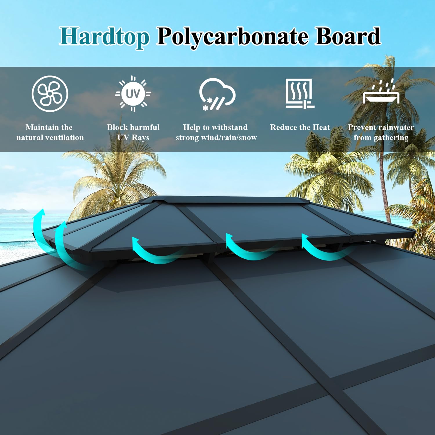 - 【UV blockieren polycarbonate board】: he double-layer top pavilion has three protective layers. The heat insulation layer filters sunlight and reduces heat, lets in just the right amount of light. Reasonable roof slope design can also make water flow out quickly to prevent rainwater from gathering.