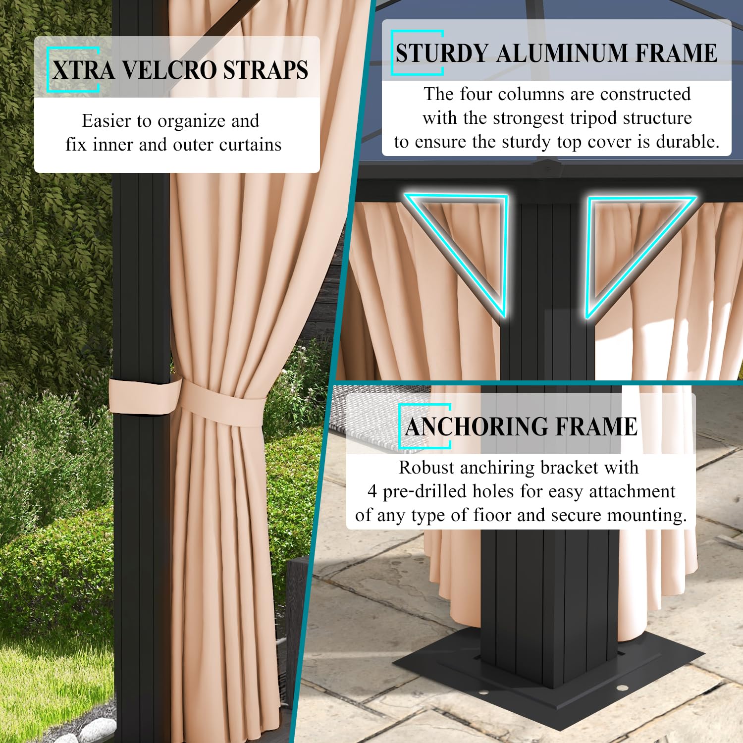 - 【Sturdy frame】The thick powder-coated aluminum frame has strong load-bearing capacity, more wind resistance, and can protect you from the influence of sunlight and bad weather in all seasons. At the same time, 4 ground piles add extra durability and safety to our aluminum pavilion.