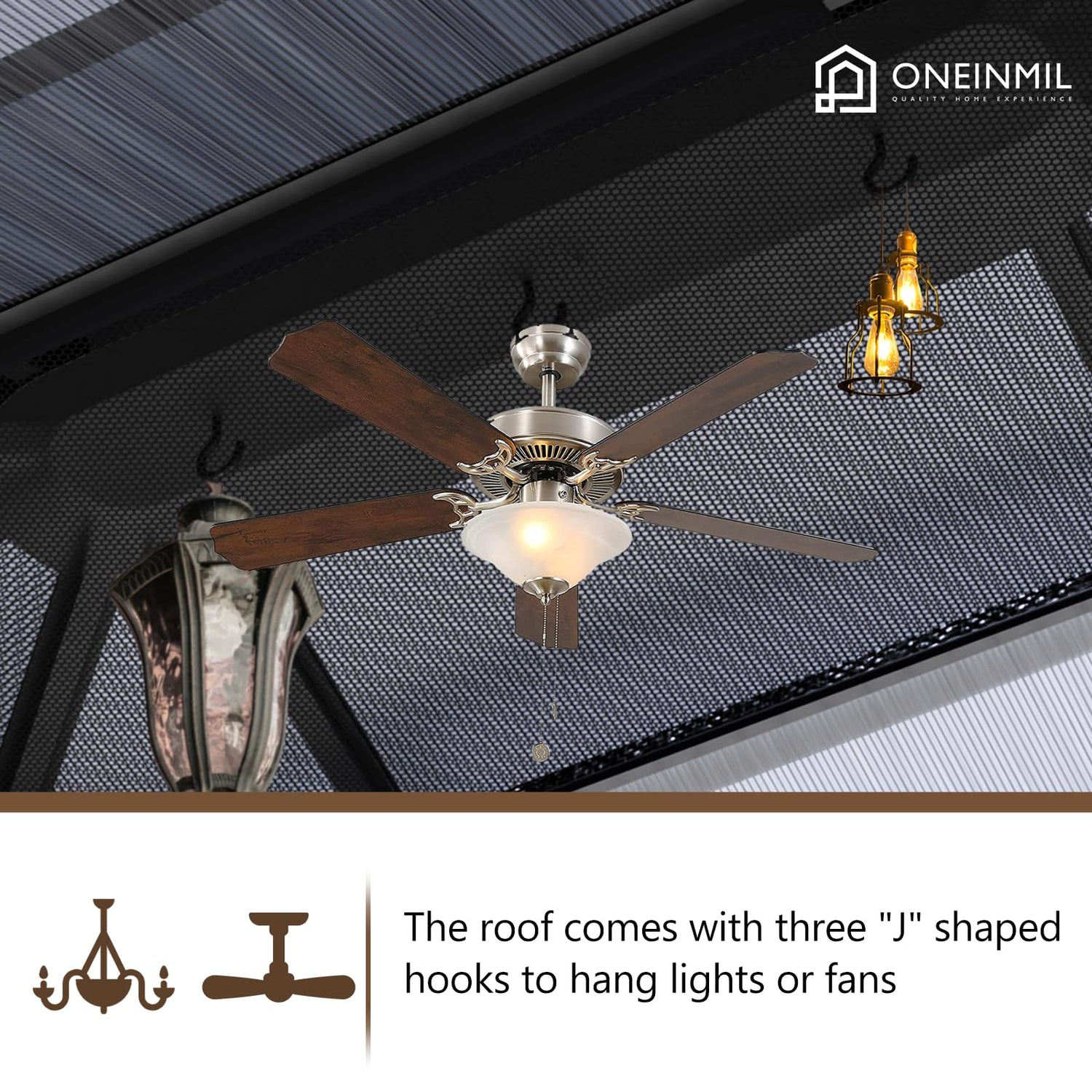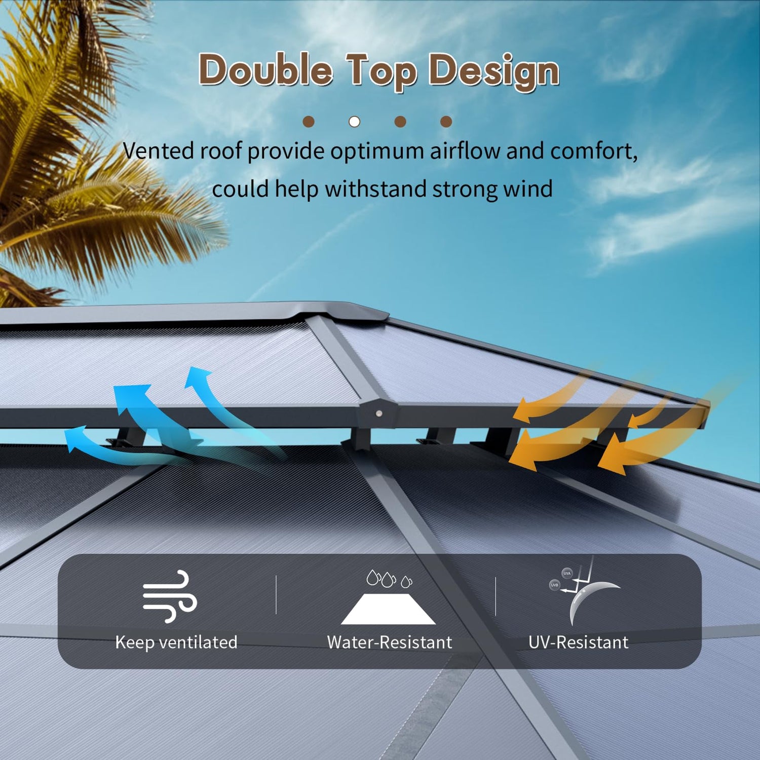 - 【Double-layer Roof】 Featuring double-layer polycarbonate top, the patio gazebo can help prevent harmful UV rays while allowing air circulation. Also, you can enjoy the sunbathe under this pavilion without worrying about getting sunburned. Hooks are designed for lamps or fans hanging and each of them can hold up to 44lbs. (Please note that the polycarbonate roof can only block UV rays rather than high temperatures and strong light).