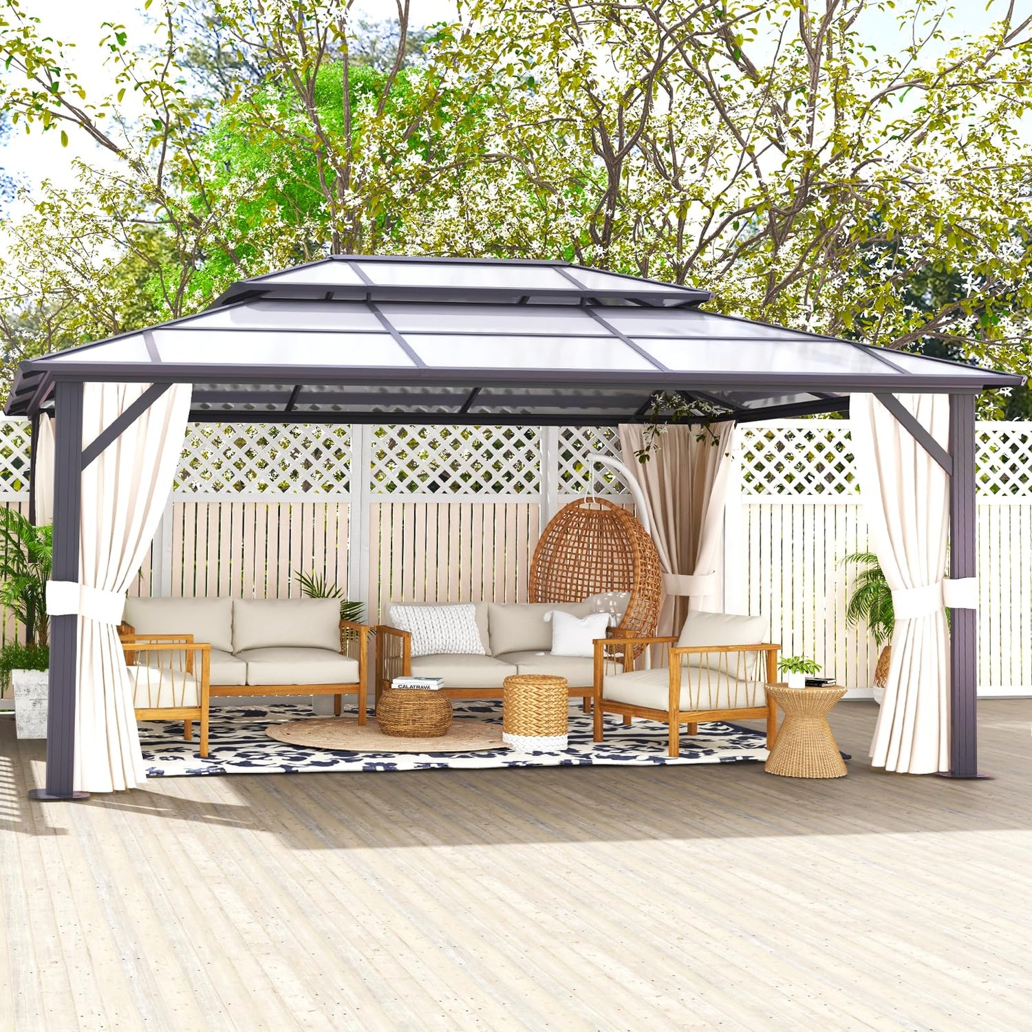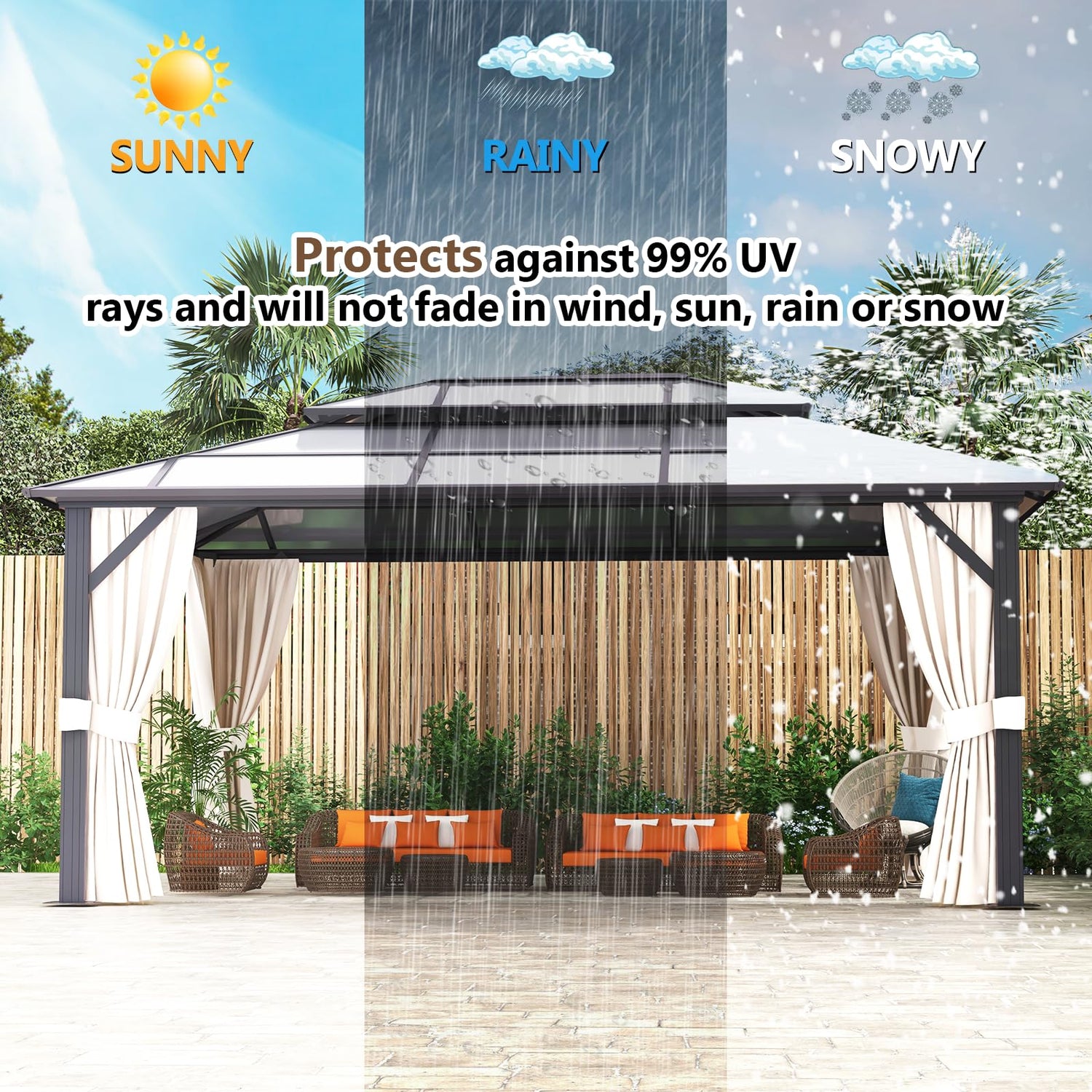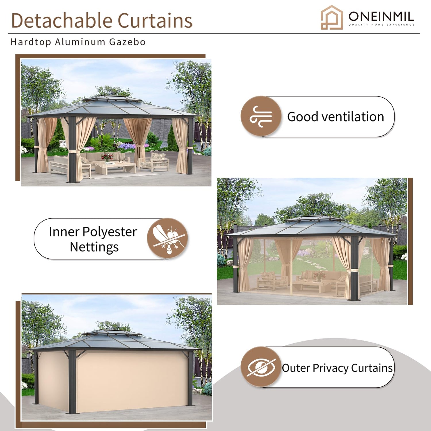 oneinmil 12x16FT Outdoor Polycarbonate Gazebo, Heavy Duty Double Roof Hardtop Gazebo with Aluminum Frame and Netting and Curtains for Patios