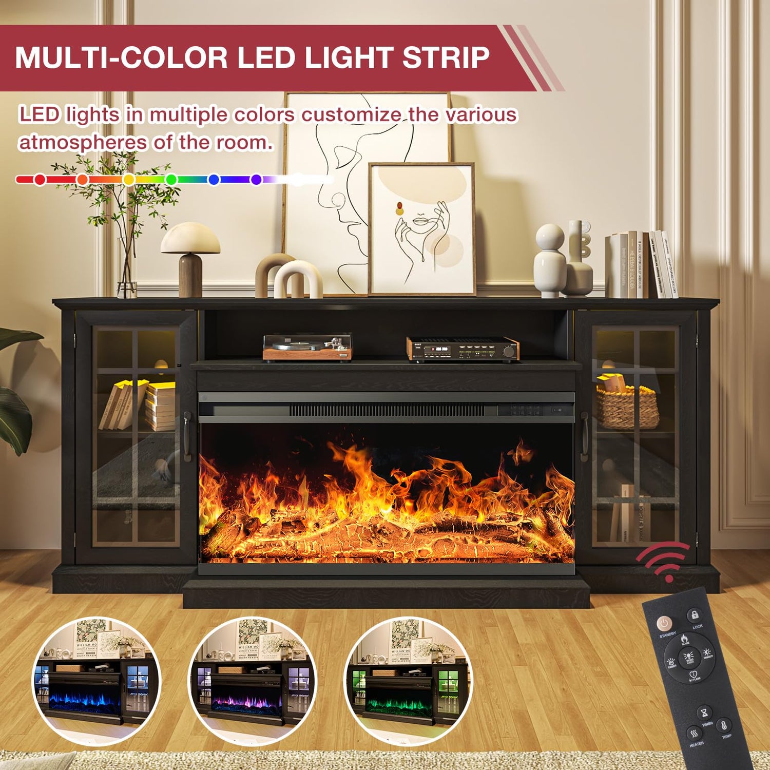 - 3-Side Glass Display Fireplace: 24 inch fireplace featuring 5 settings for flame brightness, 12 colors of backlight and 12 LED colors of light strips, Besides, it allows you to adjust the temperature from 60°F to 99°F and the time setting is from 0.5 to 9 hours