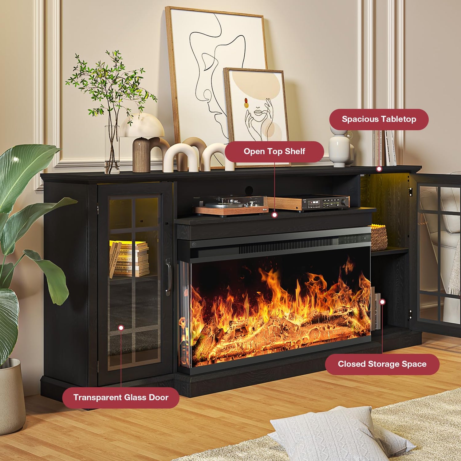 oneinmil 36 Inch 3-Sided Glass Fireplace TV Stand for TVs up to 80", Rustic Media Entertainment Center Console Table with Glass Door Closed Storage, Set of TV Table, Black
