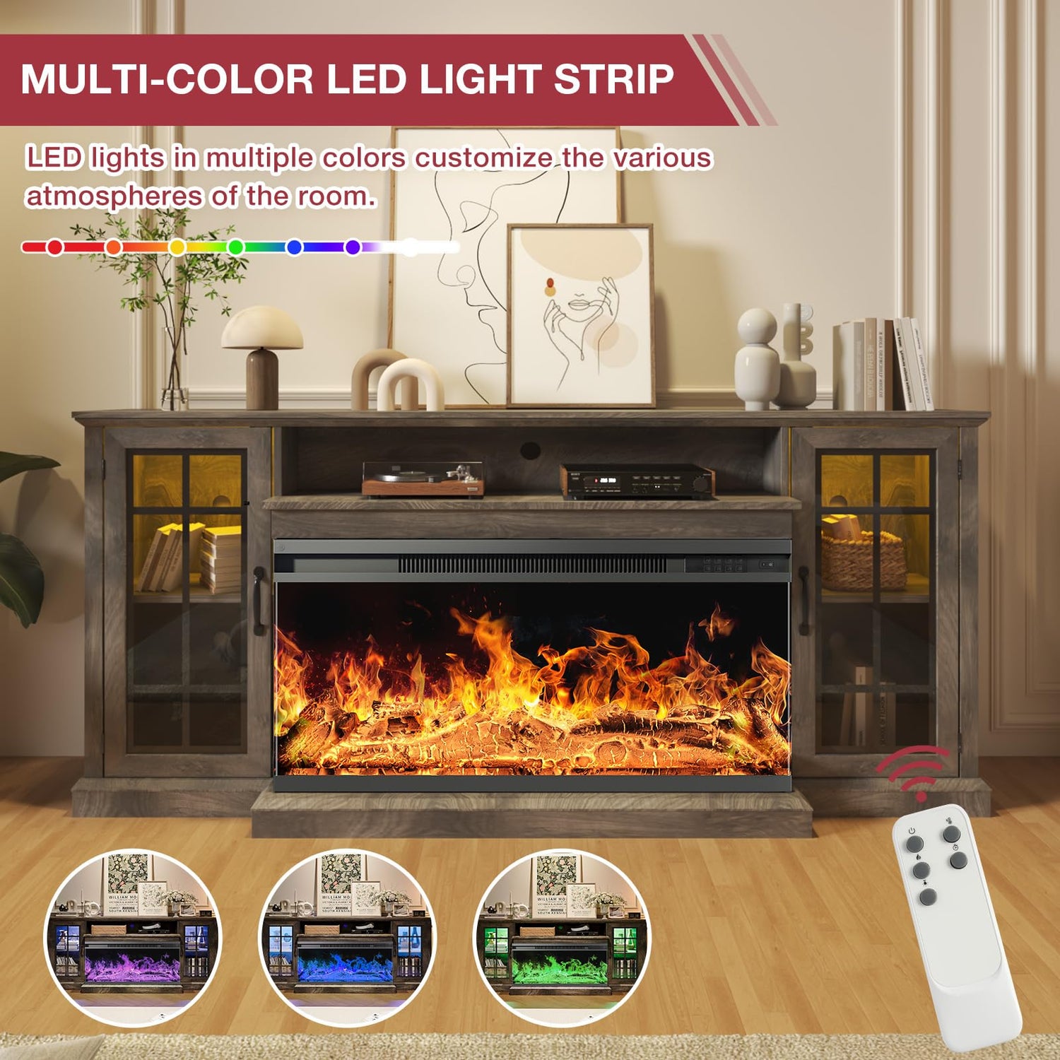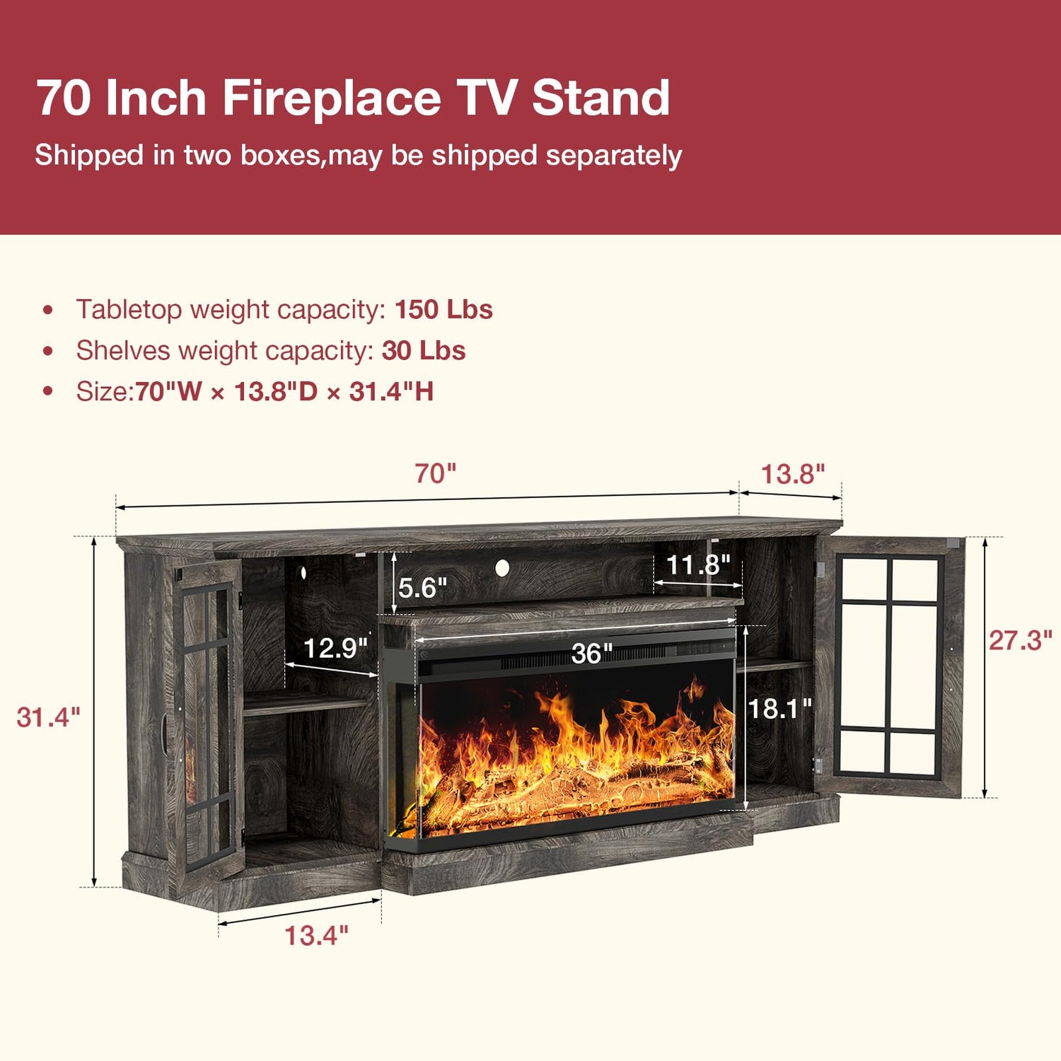 oneinmil 36 Inch 3-Sided Glass Fireplace TV Stand for TVs up to 80", Rustic Media Entertainment Center Console Table with Glass Door Closed Storage, Set of TV Table, Grey