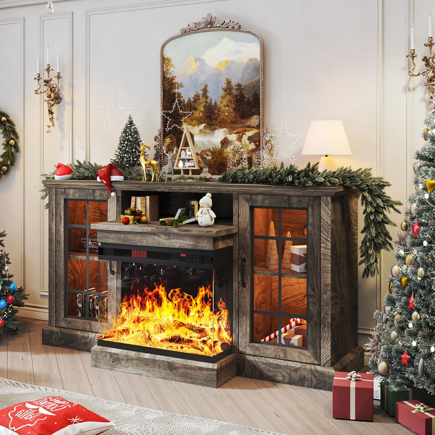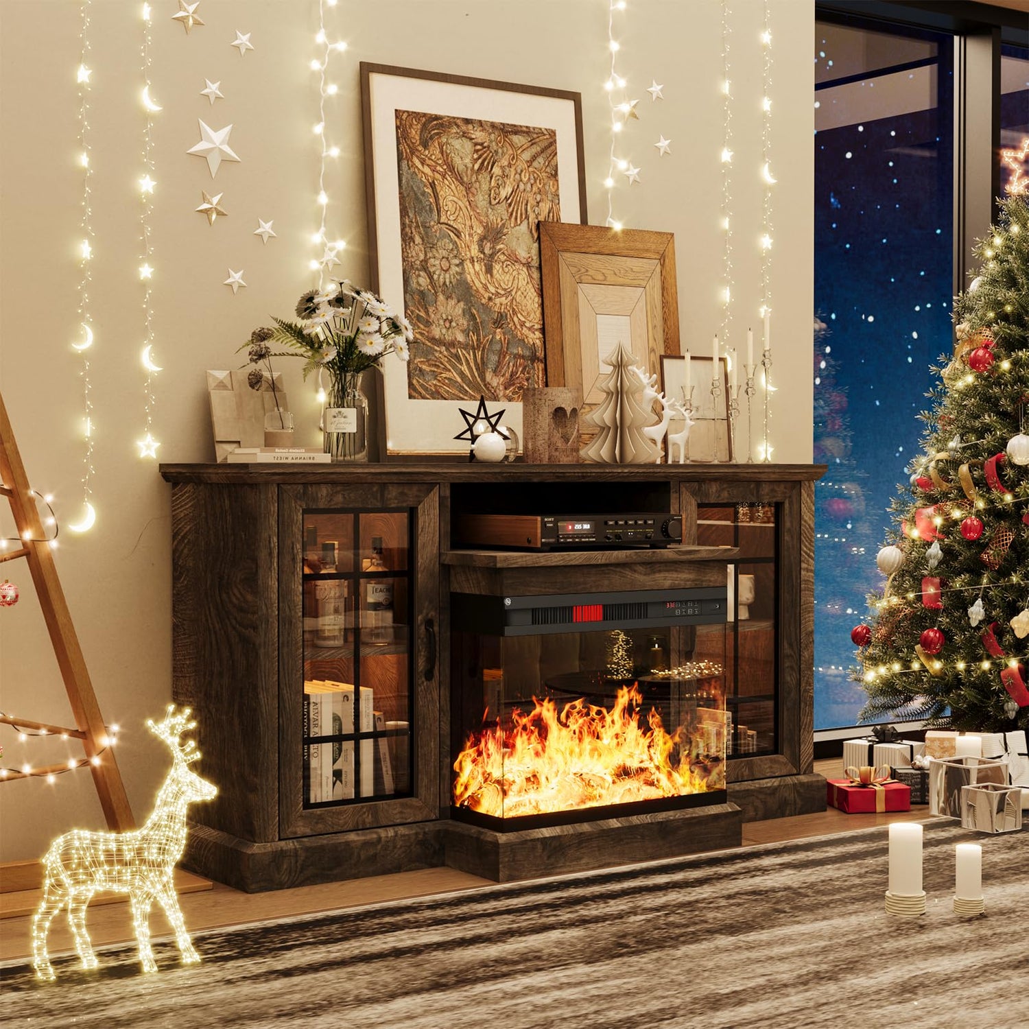 oneinmil 59'' Fireplace TV Stand, 3 Sided Glass Media Entertainment Center Console Table for TVs up to 65'' with Glass Door Adjustable Flame LED Color for Living Room, Set of TV Table, Grey