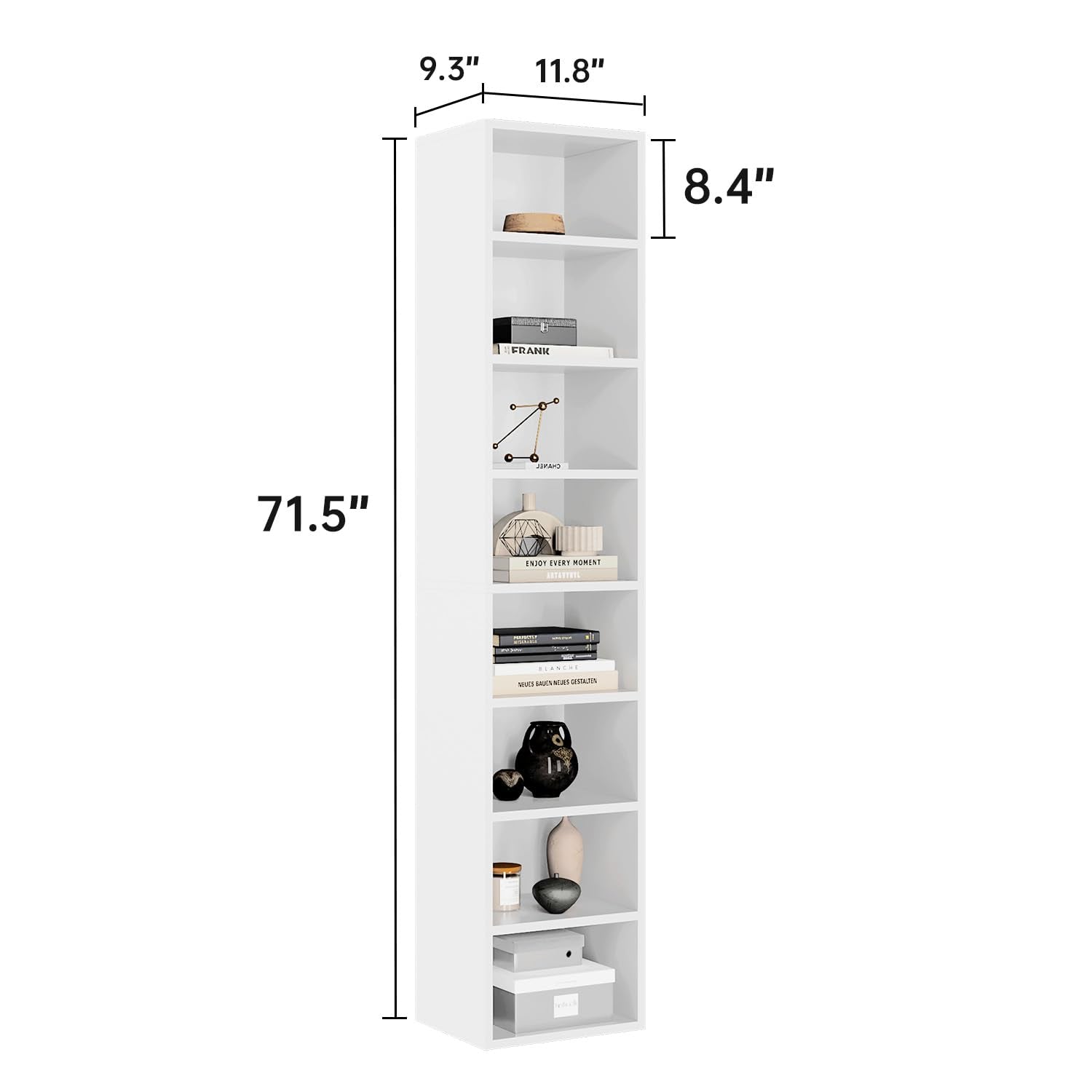 - Durable and Sturdy: 11.8“ × 9.3” × 71.5". The 8 tier bookshelf is made of high-quality particle board, which is waterproof and scratch resistant, and is very durable. The simple design can match with most decorative styles, adding elegance to your room
