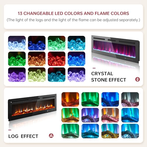 - High-Tech Electric Fireplace: Our fireplace has realistic 3D flame effects and glowing logs. The warm ambiance is provided but without dust, firewood, or smoke. Users can enjoy 12 changeable LED colors and five levels of flame brightness. Adjustable temperature settings from 62°F to 82°F. You can revise the timer from 0H to 9H