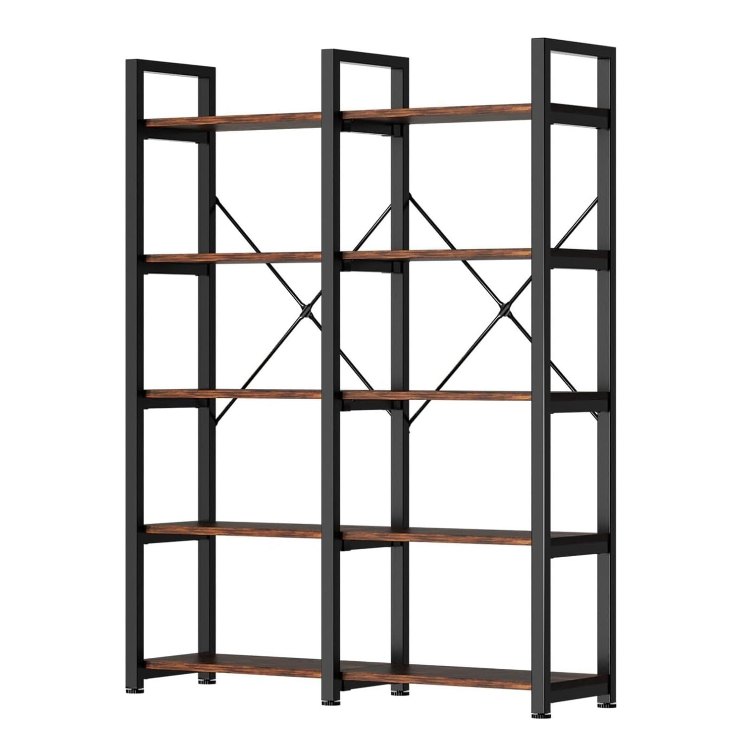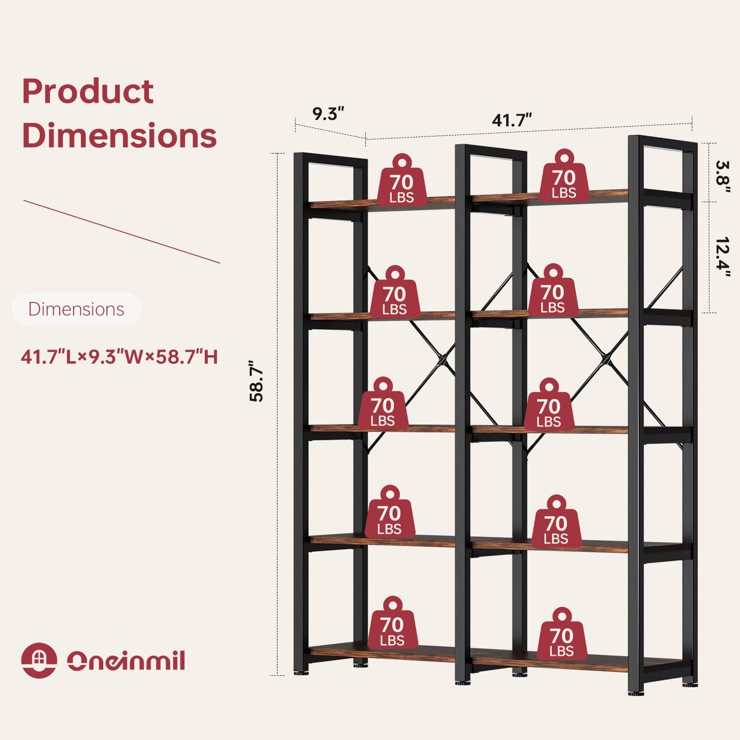 oneinmil Bookshelf 5 Tier, 58.7'' Industrial Book Shelf, Wooden Bookshelves with 10 Open Display Shelves, Vintage Storage Rack, Standing Wide Bookcase for Home and Office, Rustic Brown