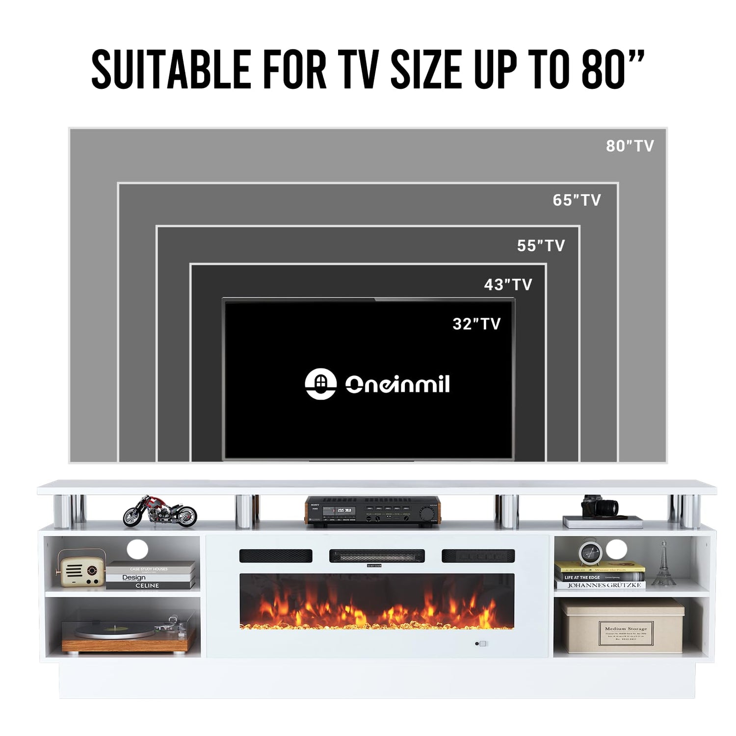 oneinmil Fireplace TV Stand with 36” Electric Fireplace, 70” 2 Tier TV Console Stand for TVs Up to 80", LED Light Entertainment Center, Fireplace for The Living Room TV Stand, White