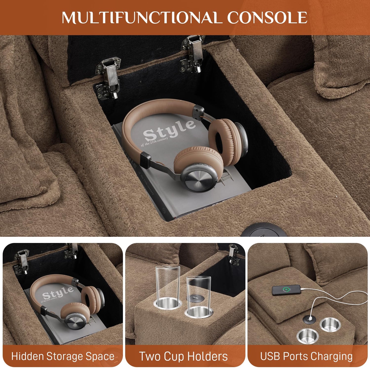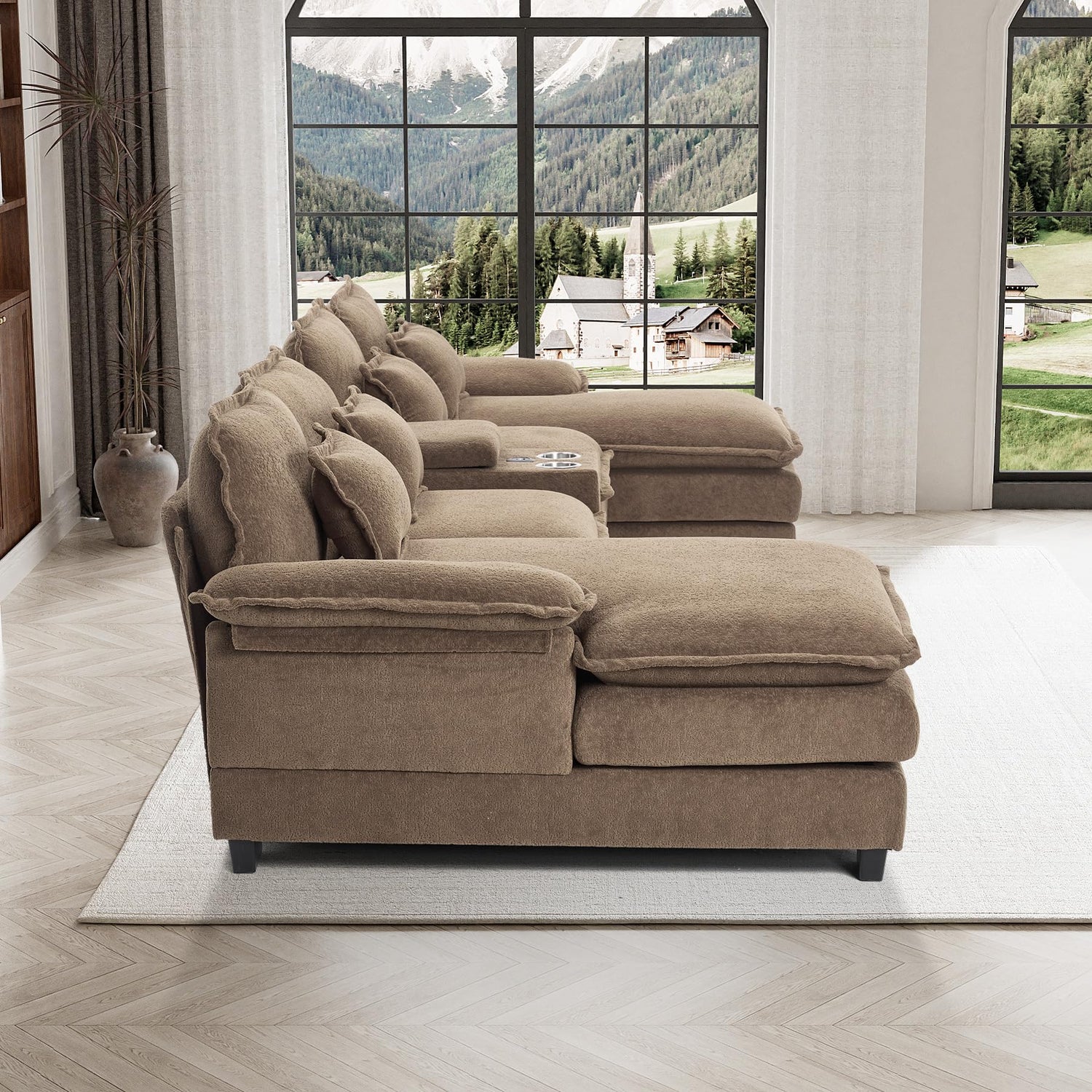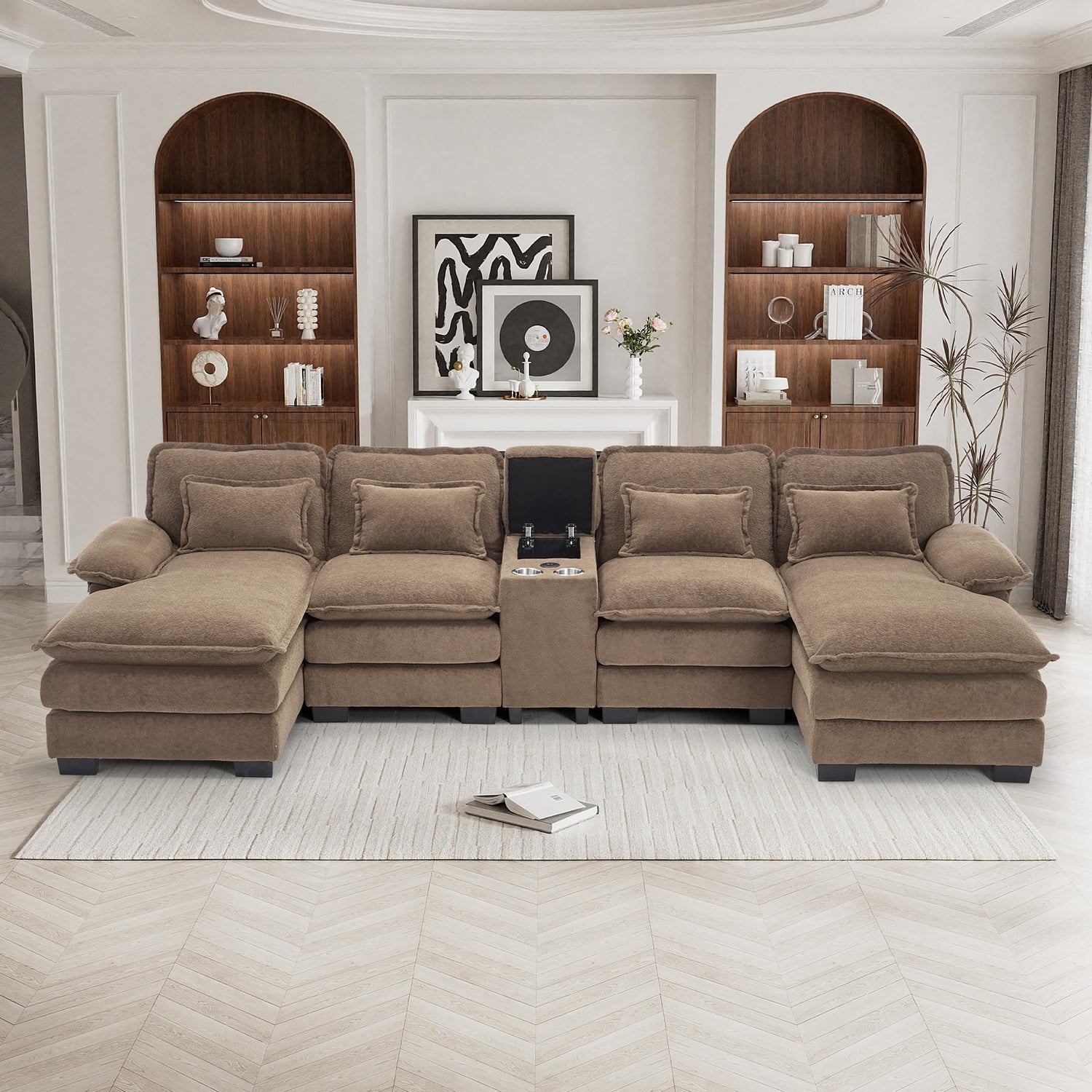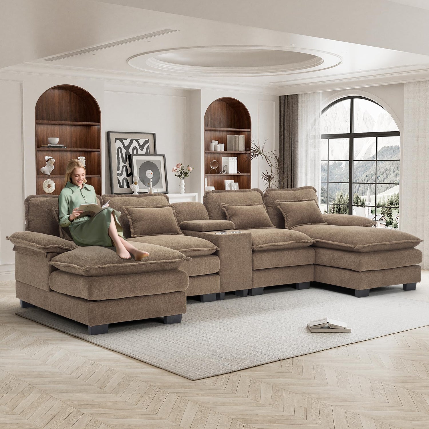 ONEMMLION U Shaped Cloud Couch Sectional Sofa, 124" Comfy Fluffy Chenille Brown Sectional Couches for Living Room with Double Chaise Lounge, Modern Modular Sofa with Central Console USB Port