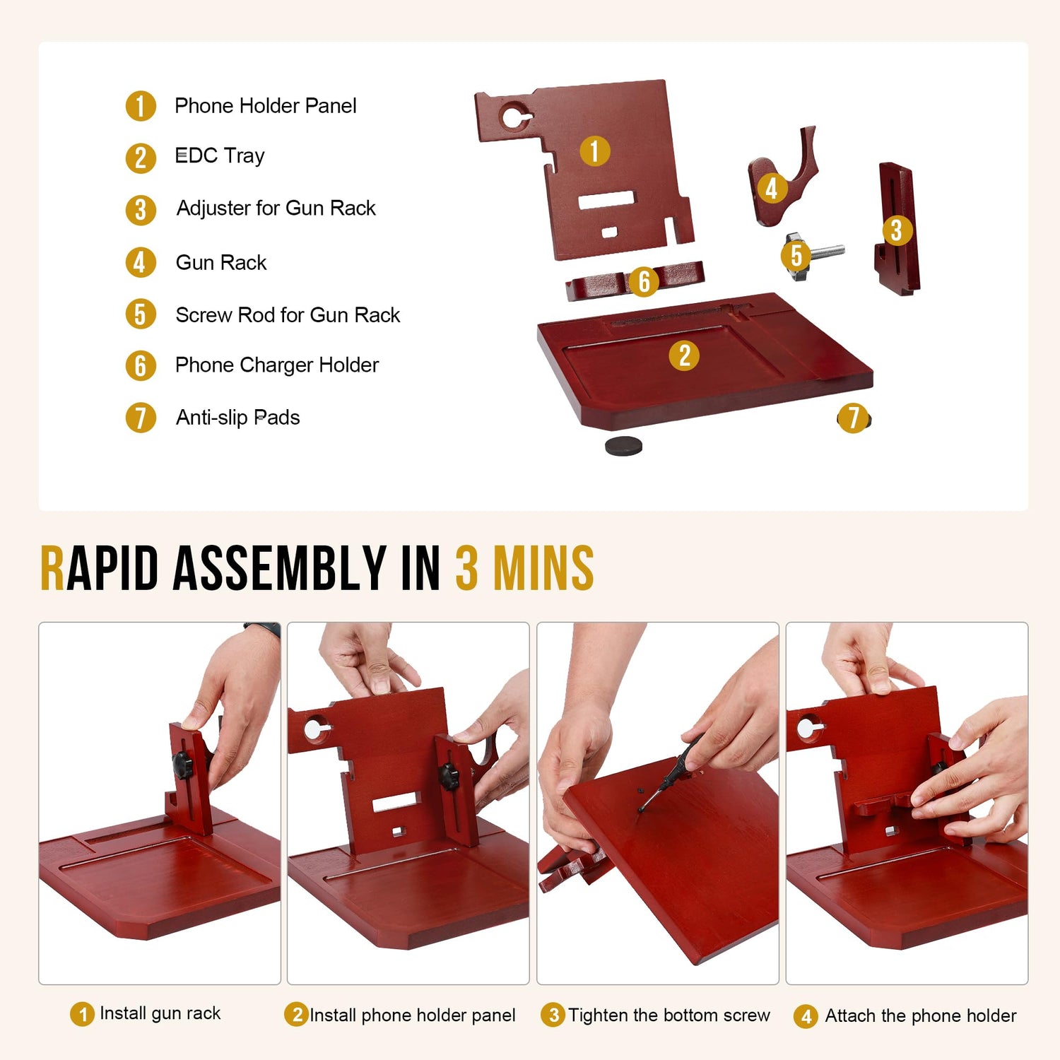 - VERSATILE GUN RACK: The wooden charging station can easily be assembled in a matter of seconds. The gun rack holster is adjustable up and down, allowing you to customize it to fit your hand gun securely. Anti-slip pads are included to ensure that your earphone and gun stay in place and avoid any scratches