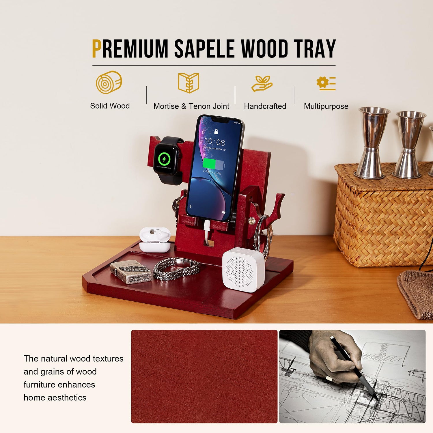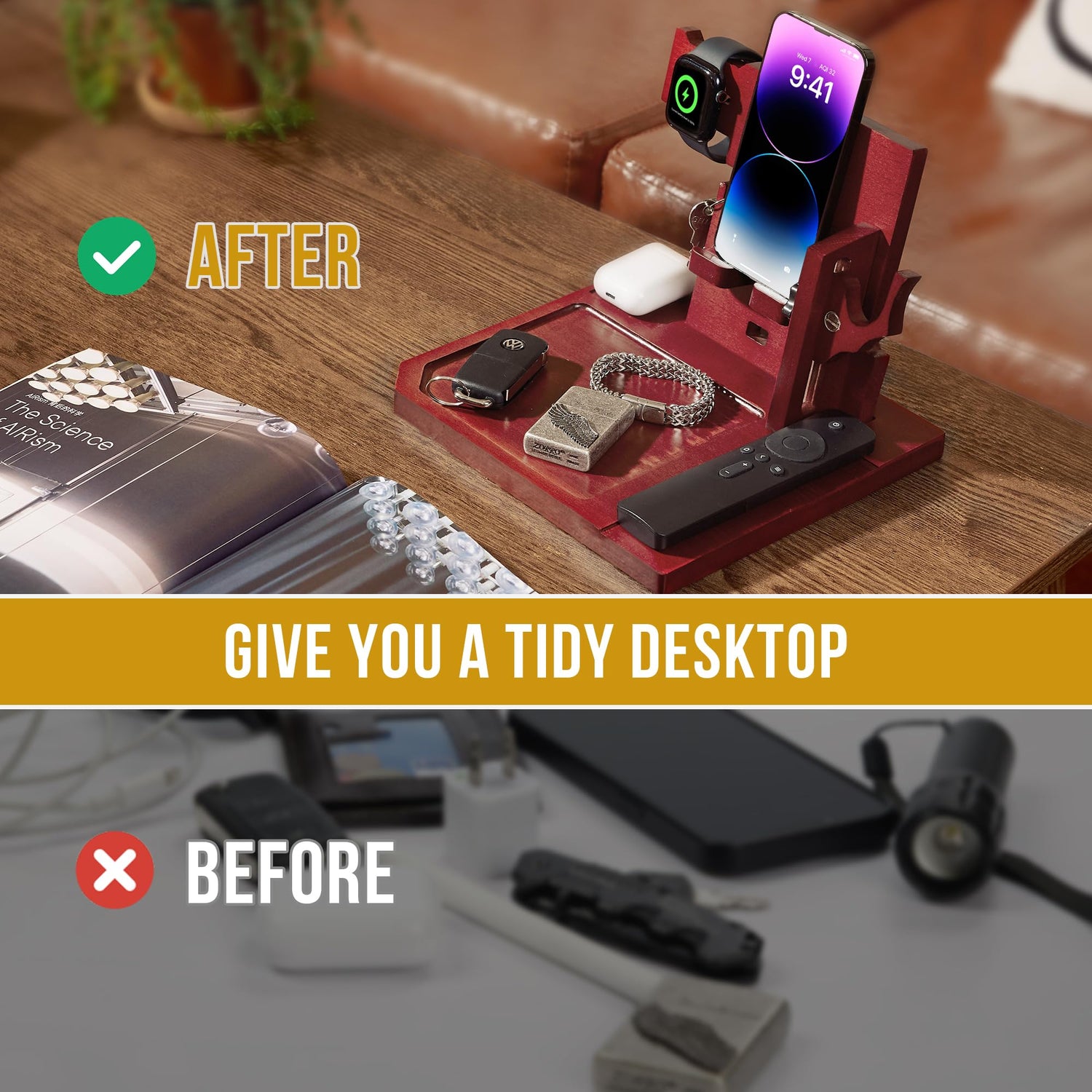 - ALL-IN-ONE NIGHTSTAND ORGANIZER: Our bedside table organizer not only provides a convenient charging management solution but also can storage your night stand accessories. The nightstand organizer for men works with cell phones, guns, keys, glasses, rings, wallets, jewelry, watches, coins, and more, helping you declutter your space(ONLY wooden cell phone holder included)