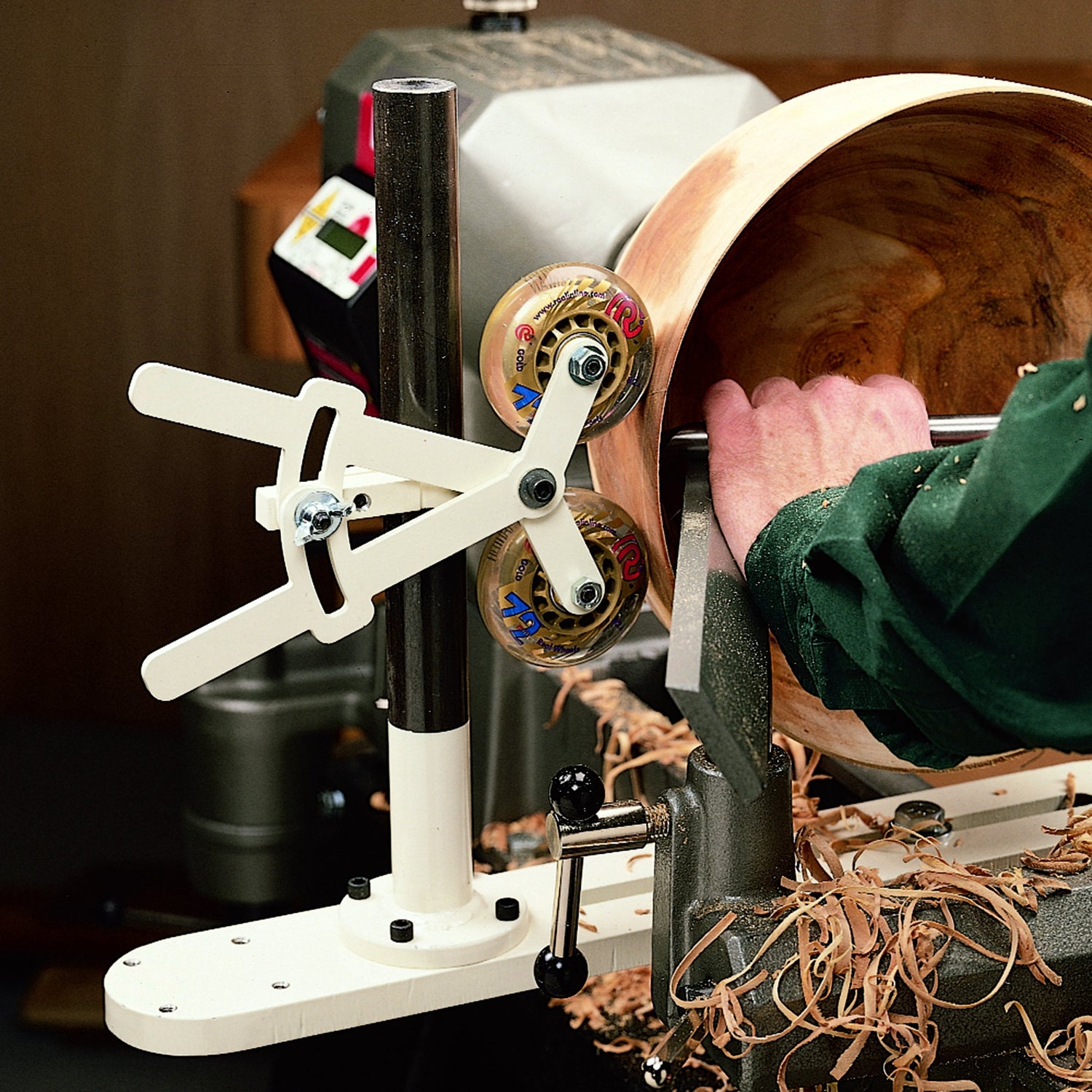 Details: Reduce vibration at the rim of your Bowl or Platter, making finish turning a safer, more pleasurable experience.Bowl Steady rest from Oneway has been well received by novice and professional bowl turners alike. Its very easy to set up and use, and will fit most lathes.Why a Bowl Steady?Woodturning is all about vibration and how you deal with it. Vibration can become a problem in the following situations: spinning out of balance work piecesexcess play in the spindle bearingsflexibility of the wood No matter how good the lathe is that you are turning on, the machine cannot stop vibration caused by flexibility inherent in the wood. Spindle turners have been using steady rests for as long as people have been turning wood, but bowl turners have never used them. Spindle steady rests are generally not suitable for bowls, so at the urging of Dave Lancaster (a professional bowl turner in Maine) we set out to design a steady rest that takes into account the unique demands of bowl turning.Feedback from turners testing the design has been extremely positive.The Bowl Steady is easy to put on the lathe, and on most lathes can be mounted at any time. It uses up virtually no swing, and most importantly dampens most vibration. With less vibration problems, you can employ a wider variety of cuts and cutting styles to get the finish you want.Increased SafetyThe Bowl Steady also increases the safety factor. When turning a bowl or platter, you no longer have to try to support it with your fingers
