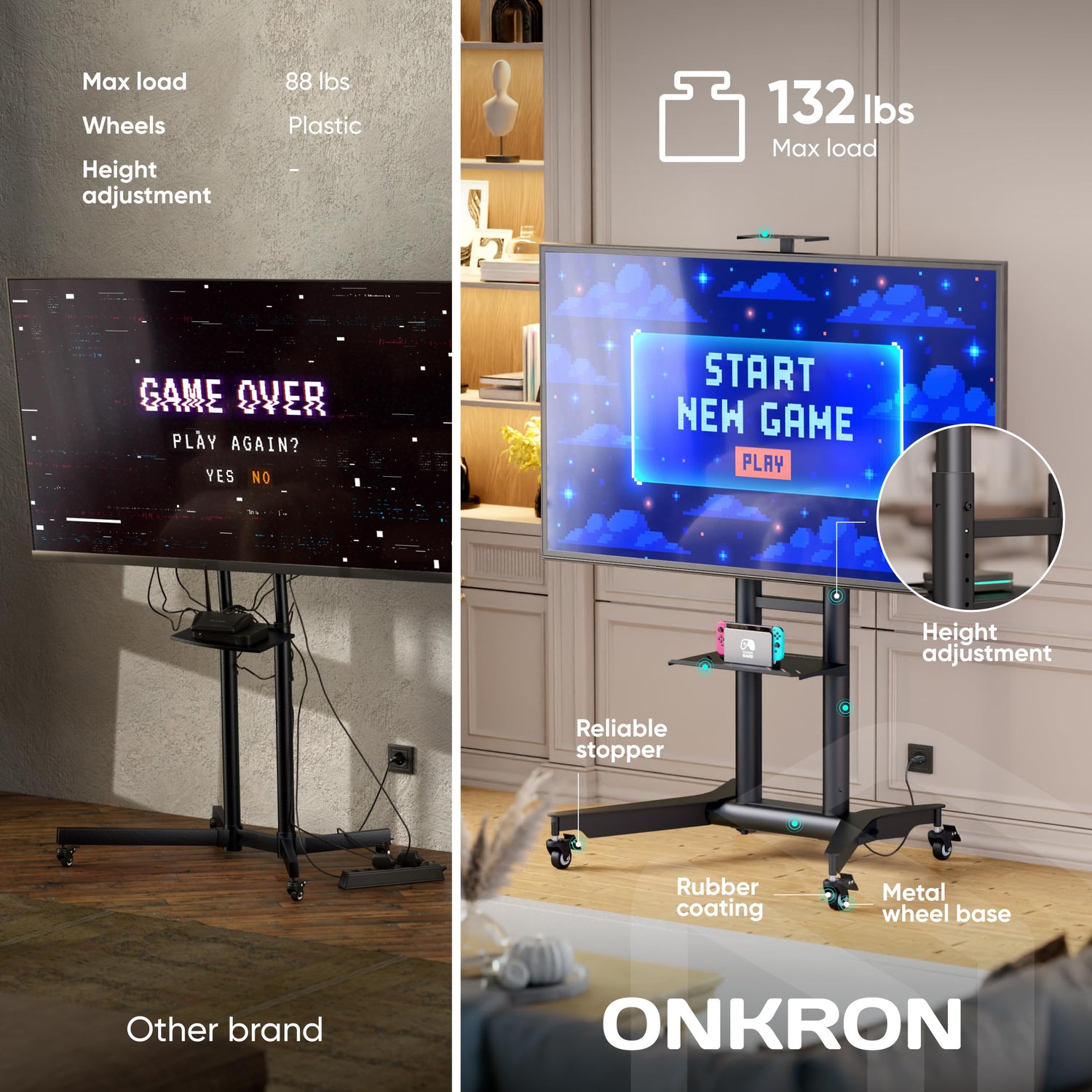 - PORTABLE TV STAND ON WHEELS | ONKRON TS1571-B is a TV mobile stand with wheels for 32 - 75 inch screens | TV rolling cart supports up to 132 lbs | Movable TV stand on wheels fits 200x200 - 600x400 VESA patterns | Rolling TV stand adjustable height can be changed from 41.9“ up to 55.8" | Upgrade your TV watching experience with our portable TV stands for flat screens !