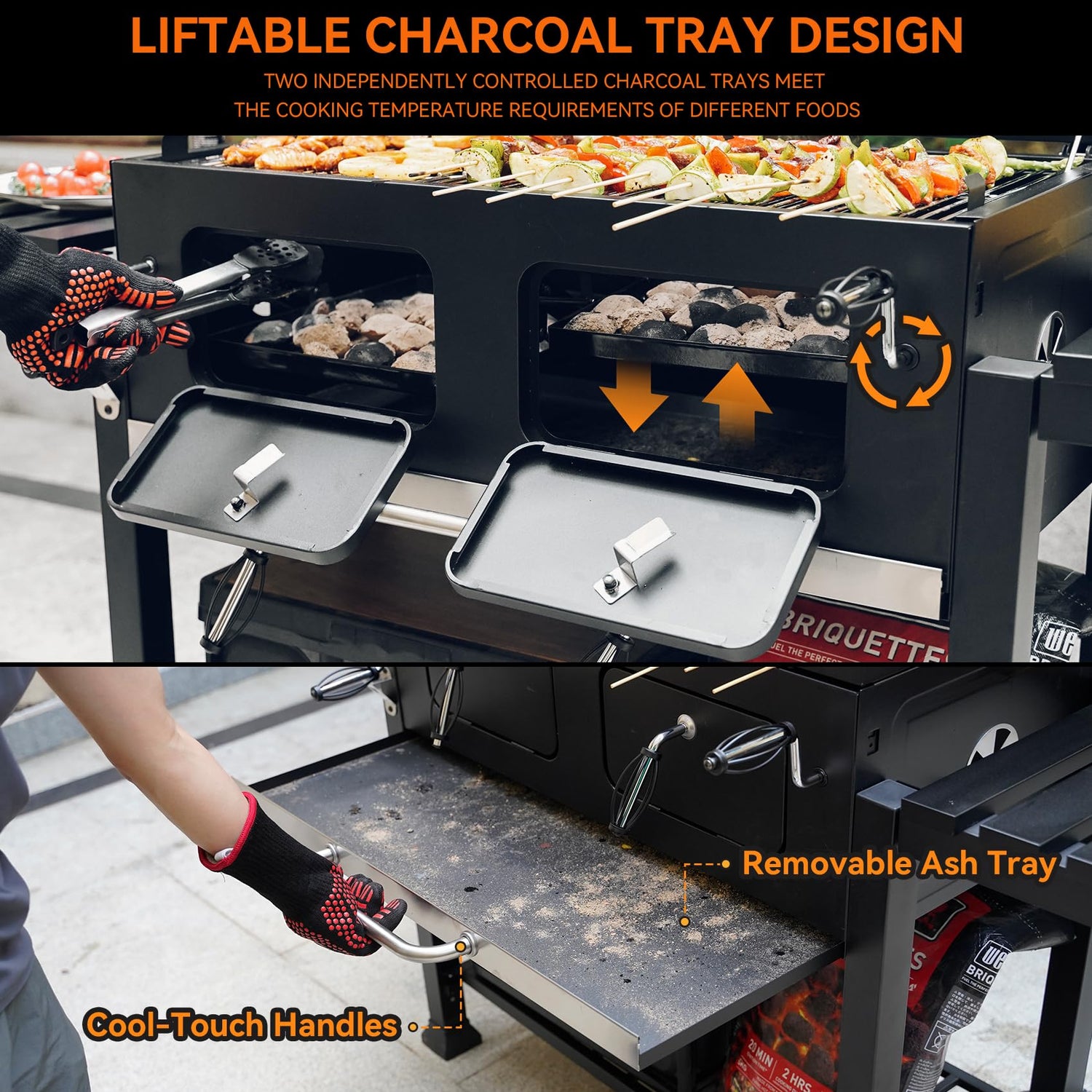 - Height-Adjustable Charcoal Tray: Easily adjust cooking temperatures with dual lifting handles that raise or lower the charcoal tray. No need to disturb your grill setup for quick temperature changes.