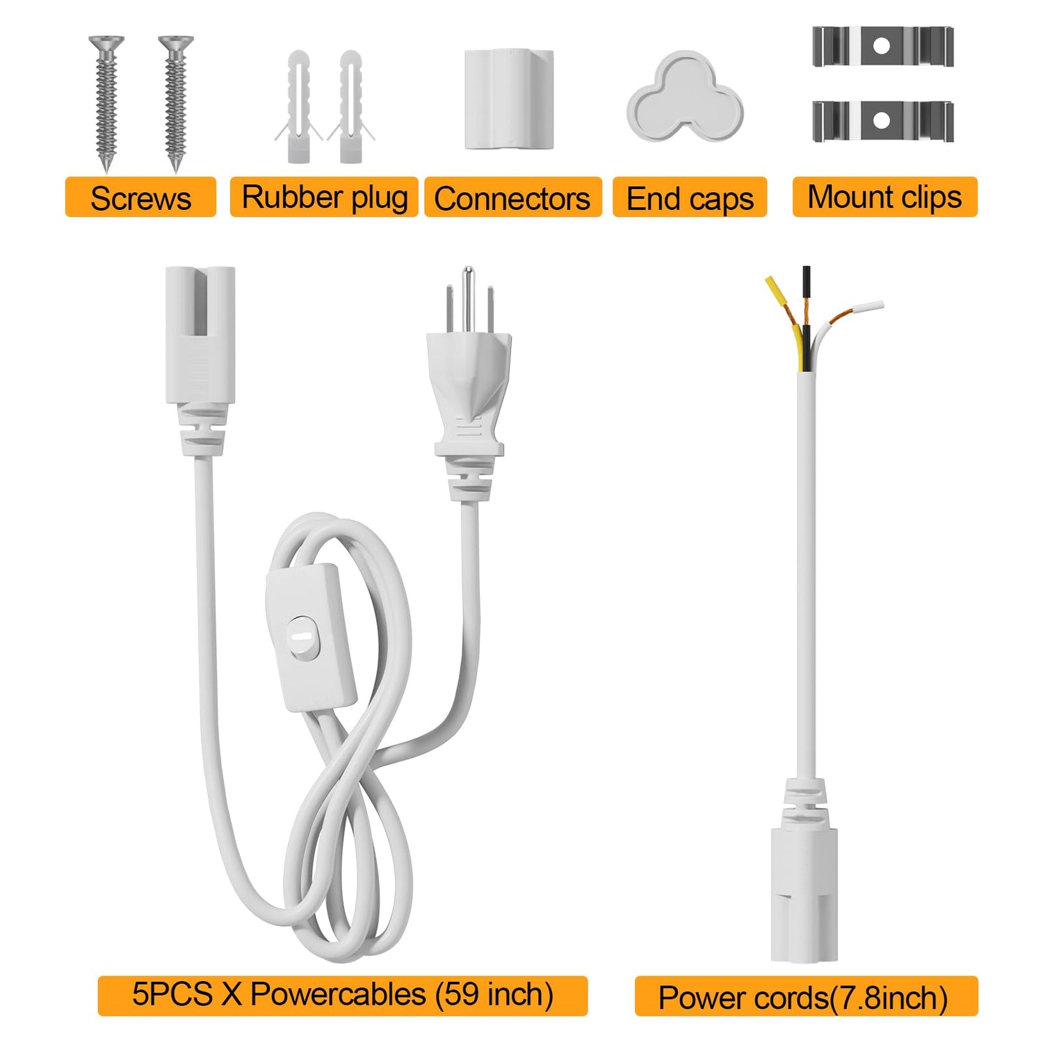 - What You Get. 10 x Onlylux 8ft led lights, 5 x Power cords with ON/OFF switch, 10 x power hardwires, 8 x 24 inches Connector cables.