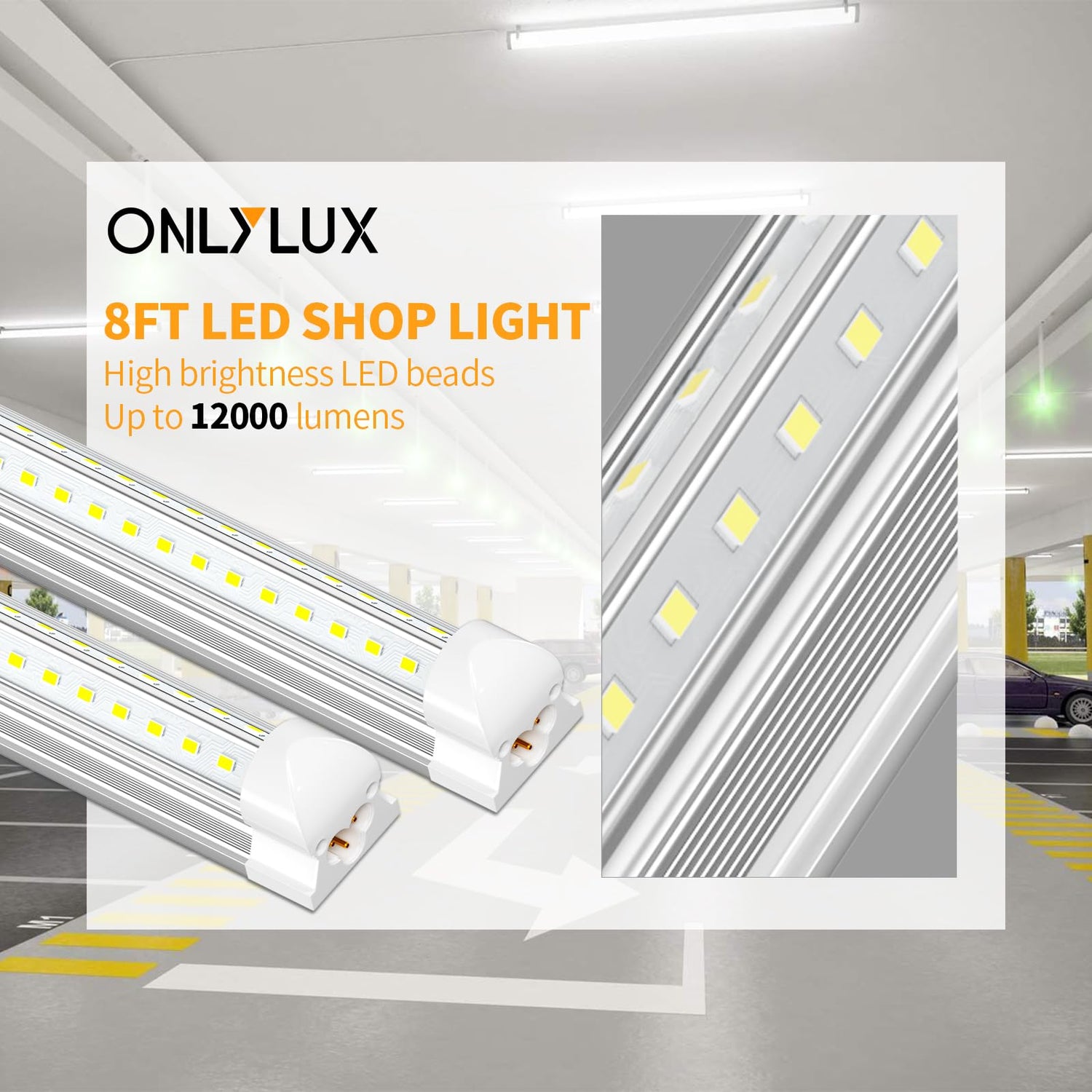 - Bright and Hight output lumens. Onlylux 8ft led shop light has 12000lm ouput. Each light 90w, amazing brightness, more energy saving.