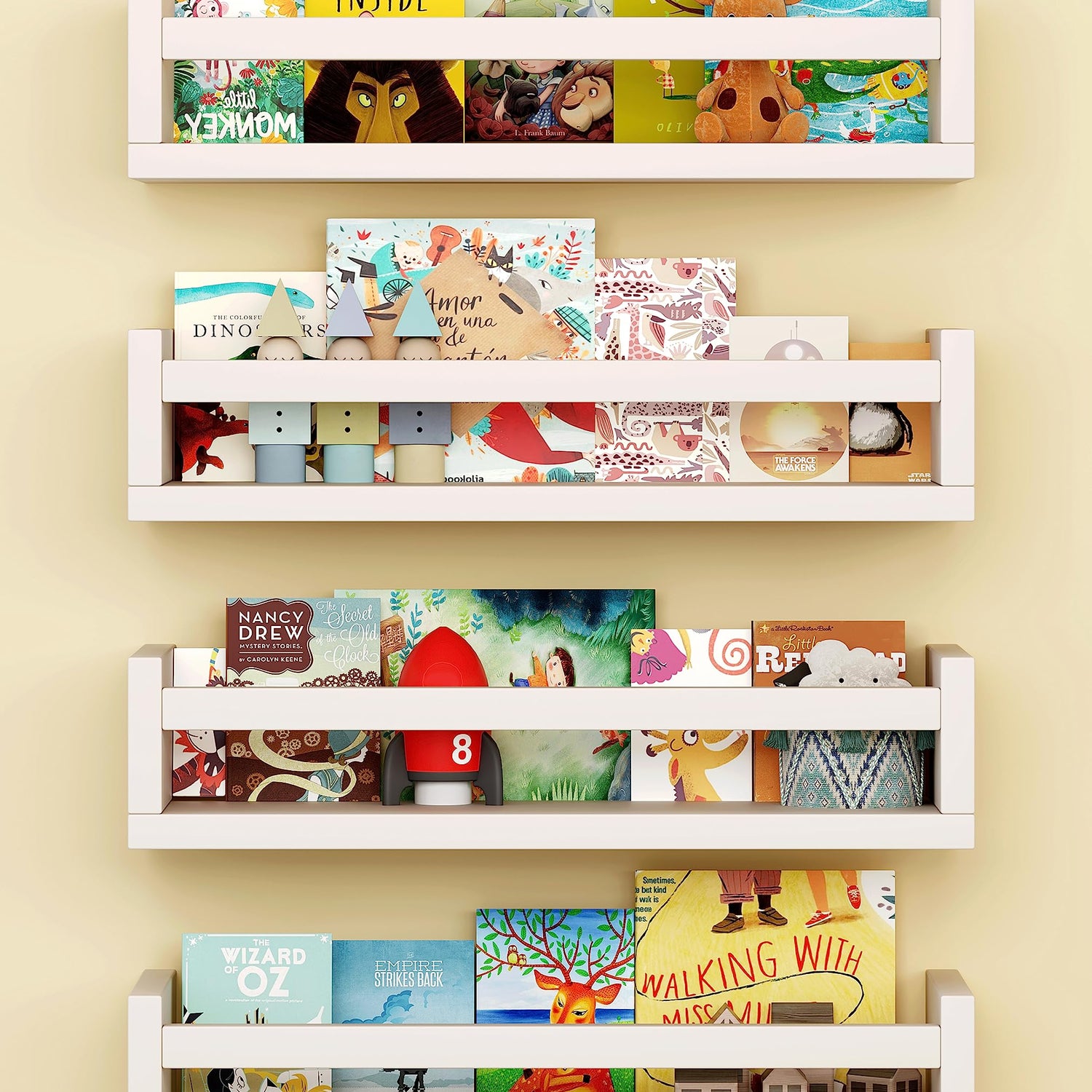 Onlysky Set of 4 Wall-Mounted Kid's Bookshelf - White Floating Nursery Book Shelves - Durable Wood Construction - Ideal for Nursery Decor, Kids Room, Toy Storage